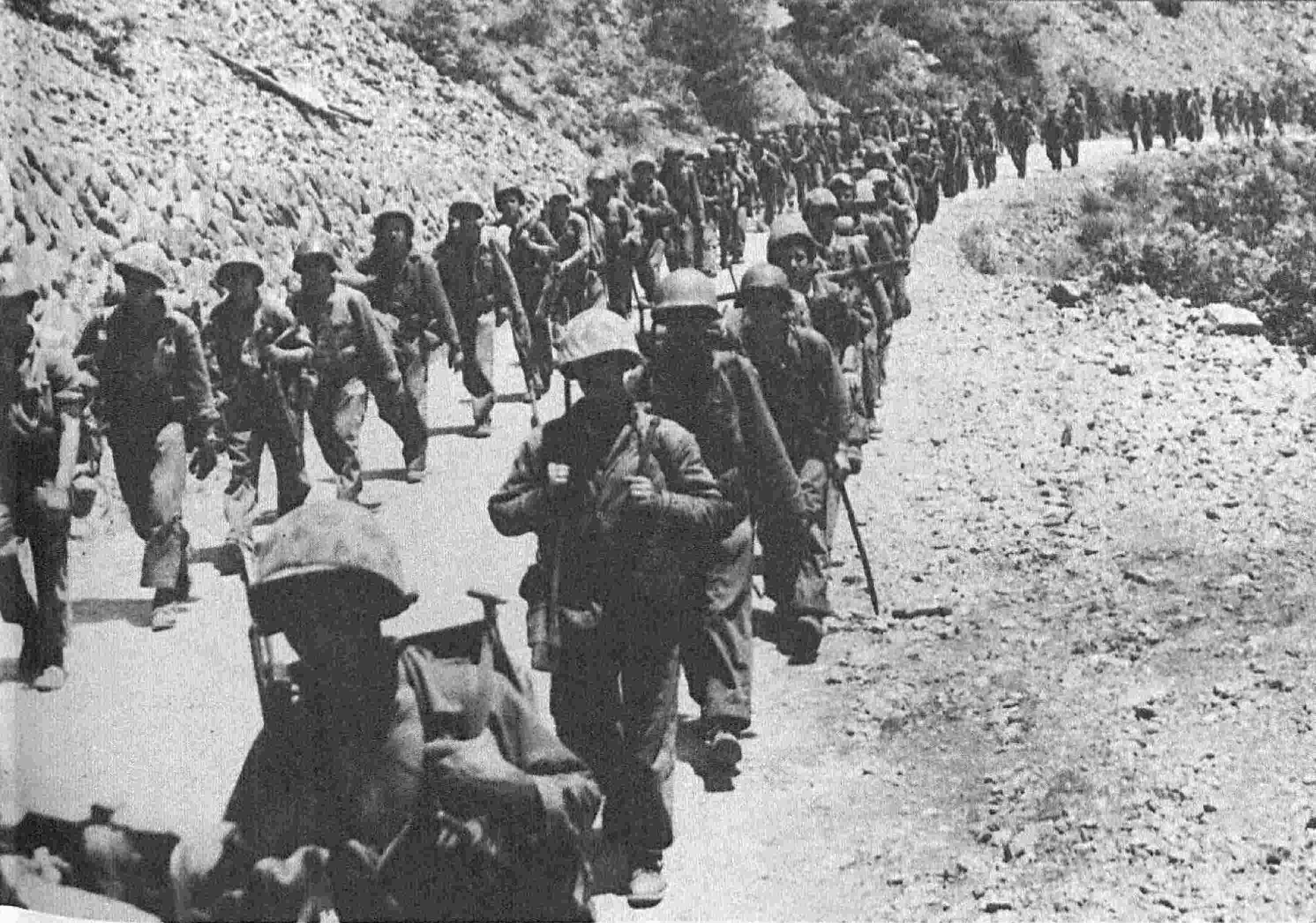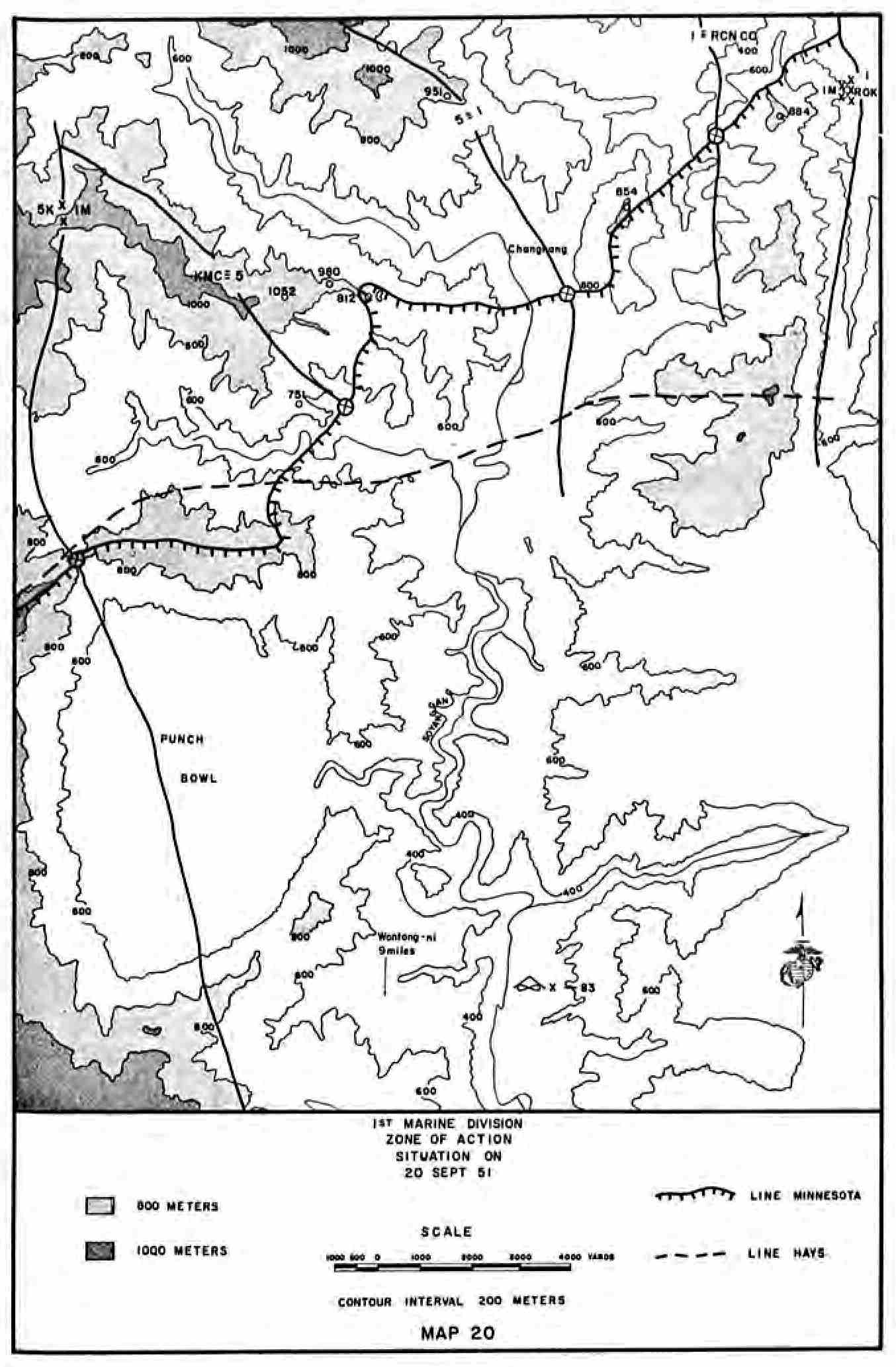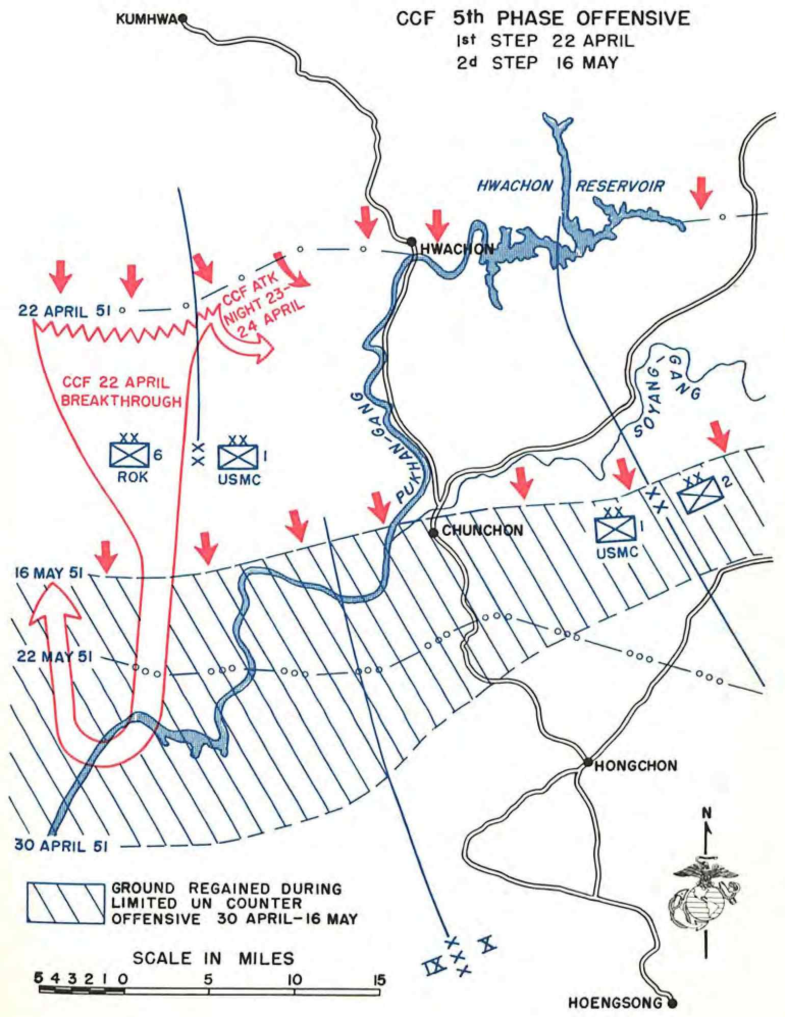 The 1st Marine Division, supported wherever possible by the 1st Marine Aircraft Wing, helped stem the flood of the Chinese offensive in April. Then lashing back in vigorous and successful counterattack, the Marines fought around the Hwachon Reservoir to the mighty fastness of the Punchbowl. The Punchbowl became familiar terrain to Marines during the summer of 1951, and the Division suffered its heaviest casualties of the year fighting in the vicinity of that aptly named circular depression.