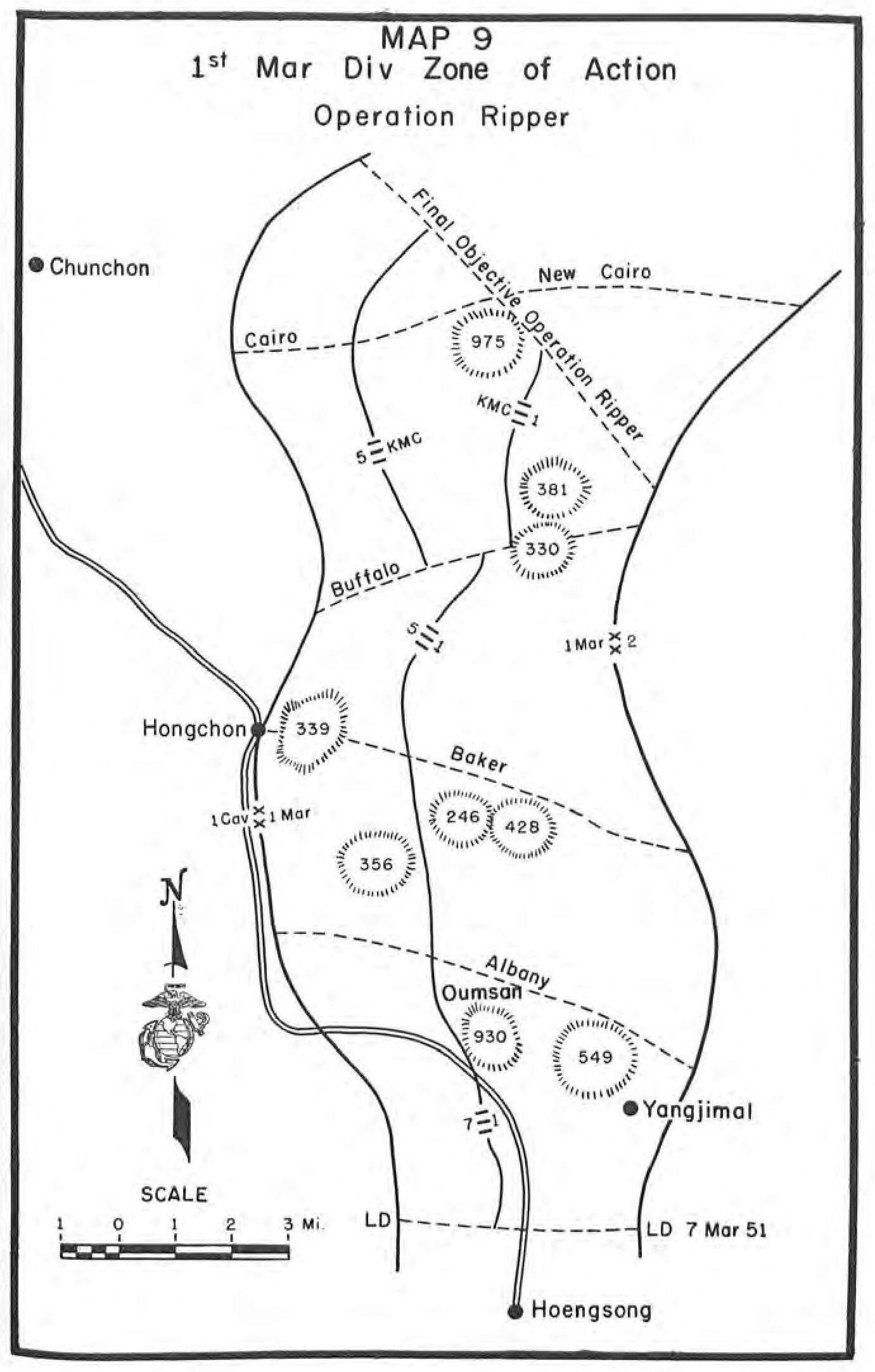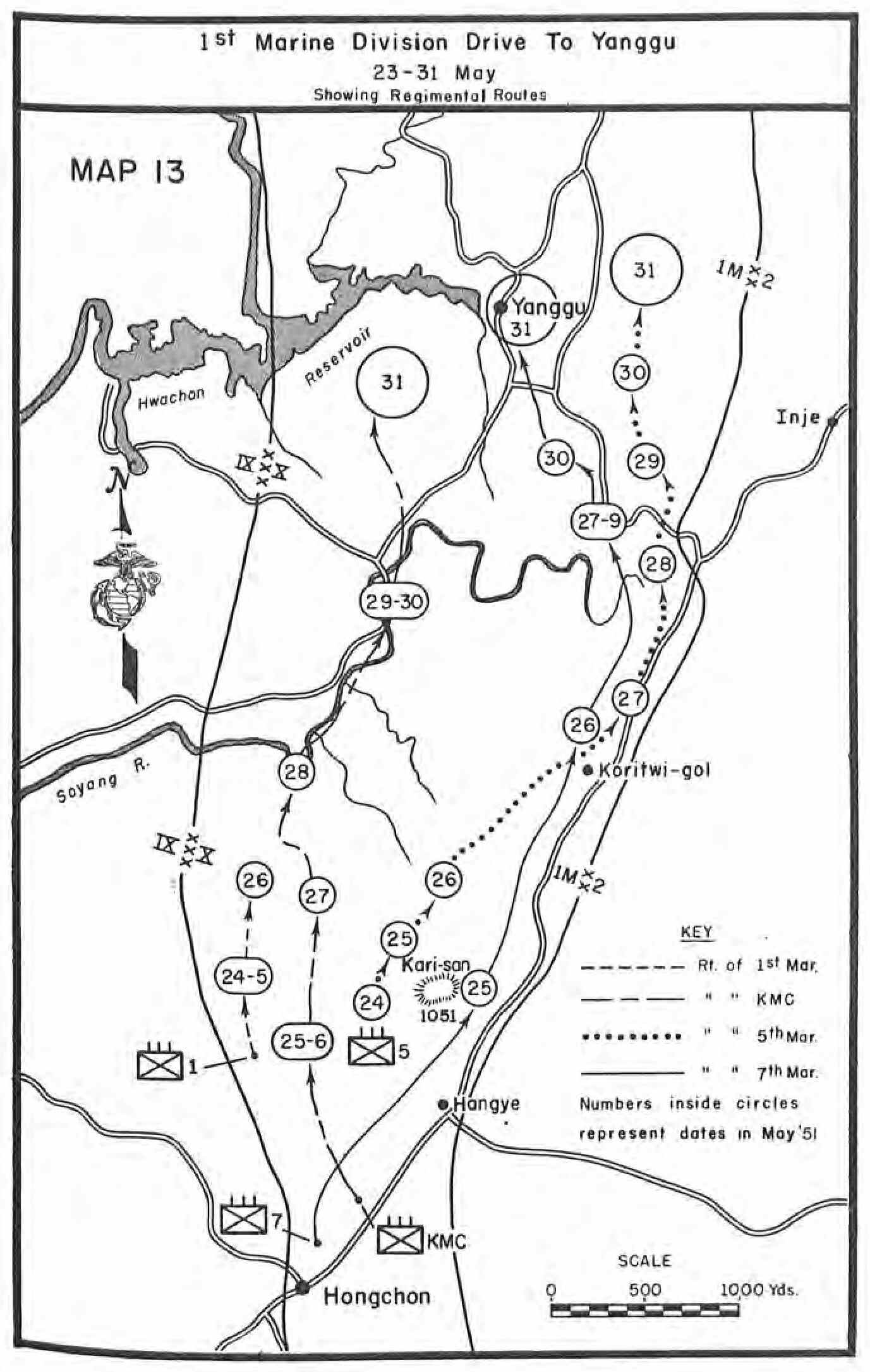 Crossing the Soyang in Flood—Light Resistance at First—Supply Problems Cause Delay—Resumption of Division Attack—The Mounting Problem of CAS—First Helicopter Supply Operation of History—The Fight for Hill 749—5th Marines Attack Hill 812—The Struggle for the “Rock” | ||