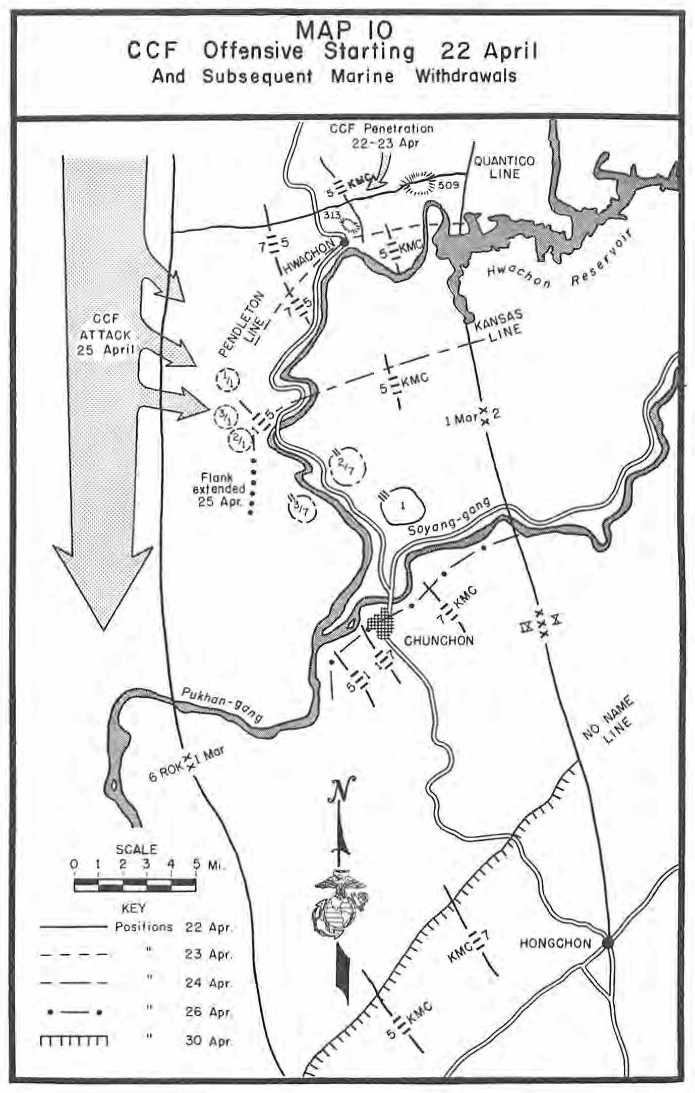 Prisoners Reveal Date of Offensive—Hwachon Occupied by KMC Regiment—CCF Breakthrough Exposes Marine Flank—MarineVIII Air in Support Everywhere—Plugging the Gap on the Marine Left—Repulse of Communist Attacks—Withdrawal to the KANSAS Line—Enemy Stopped in IX Corps Sector—1st Marine Division Returns to X Corps | ||