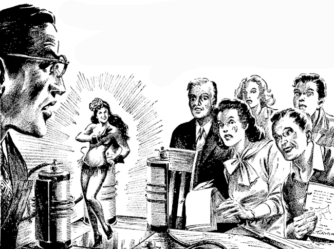 Alone, Mr. Tedder frowned at the bereft lithium battery and telegraph key. He had pressed the key, closing the circuit, and there'd been a spurt of flame. A strange girl had appeared, dancing on the marble top of the demonstration bench. He'd never seen the woman before; a tall blonde wearing very little.... What the devil! There she was again.
