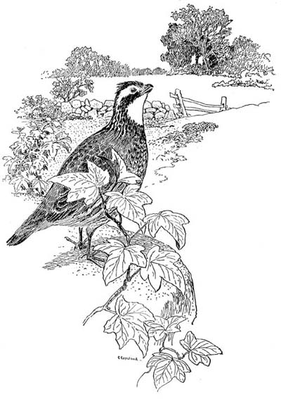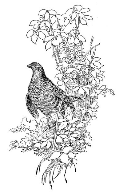 [Pg 37]That was when I sprang over a stone wall and landed fairly in the middle of a covey of partridges made up of a mother bird and what seemed a small whirlwind of young ones no bigger than my thumb. My plunge startled the mother so that she thundered away through the bushes, a thing that a mother partridge, surprised with her young, will rarely do. At the same moment the young scurried into the air. It was like a gust among a dozen brown leaves, whirling them breast high for a moment and then letting them settle to earth again. You go to pick them up and they surely are brown leaves! It is as if some woodland Merlin had waved his wand. They were young partridges, they are brown leaves. It is as quick as that.