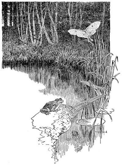 The cove was but a hundred yards across, and I stood on the bank wishing to note carefully the direction I must take. The lazy morning wind drifted[Pg 42] across, just kissing the water here and there, leaving the surface for the most part smooth. I wet my finger and held it up, dropping it cool side down till it was level. It pointed exactly toward the opposite point at the other side of the cove and between it and the next one. There a low, sloping, broad flat rock hung with a canopy of green leaves was the dock at which I might land conveniently, and I splashed resolutely into the water, scaring almost to death with my plunge a big green frog that was sunning himself on a little foot-square cranberry bog island. He gave a shrill little yelp of terror and dived before I could.