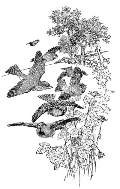 [Pg 10]The pasture is the happy hunting-ground of the hawks and owls, though they dwell by preference in the deep wood, the nearer approaching to the forest primeval the better, but the crow often nests in a pine among a group of several in the pasture. The pasture is peculiarly the home of scores of varieties of what one might term the half wild birds, the thrushes from honest robin down to the catbird, warblers, finches, and a host of others who are as shy of the deep woods as they are of the highway; and here, in those magic hours that come between the first faint flush of dawn and sunrise, you may hear the full chorus of their matins swell in triumphant jubilation.