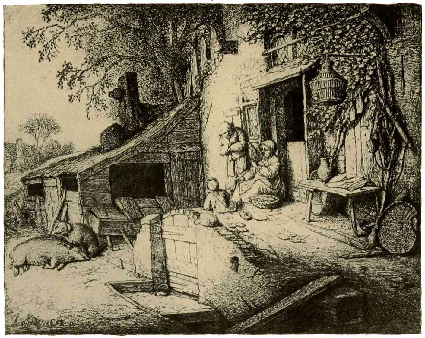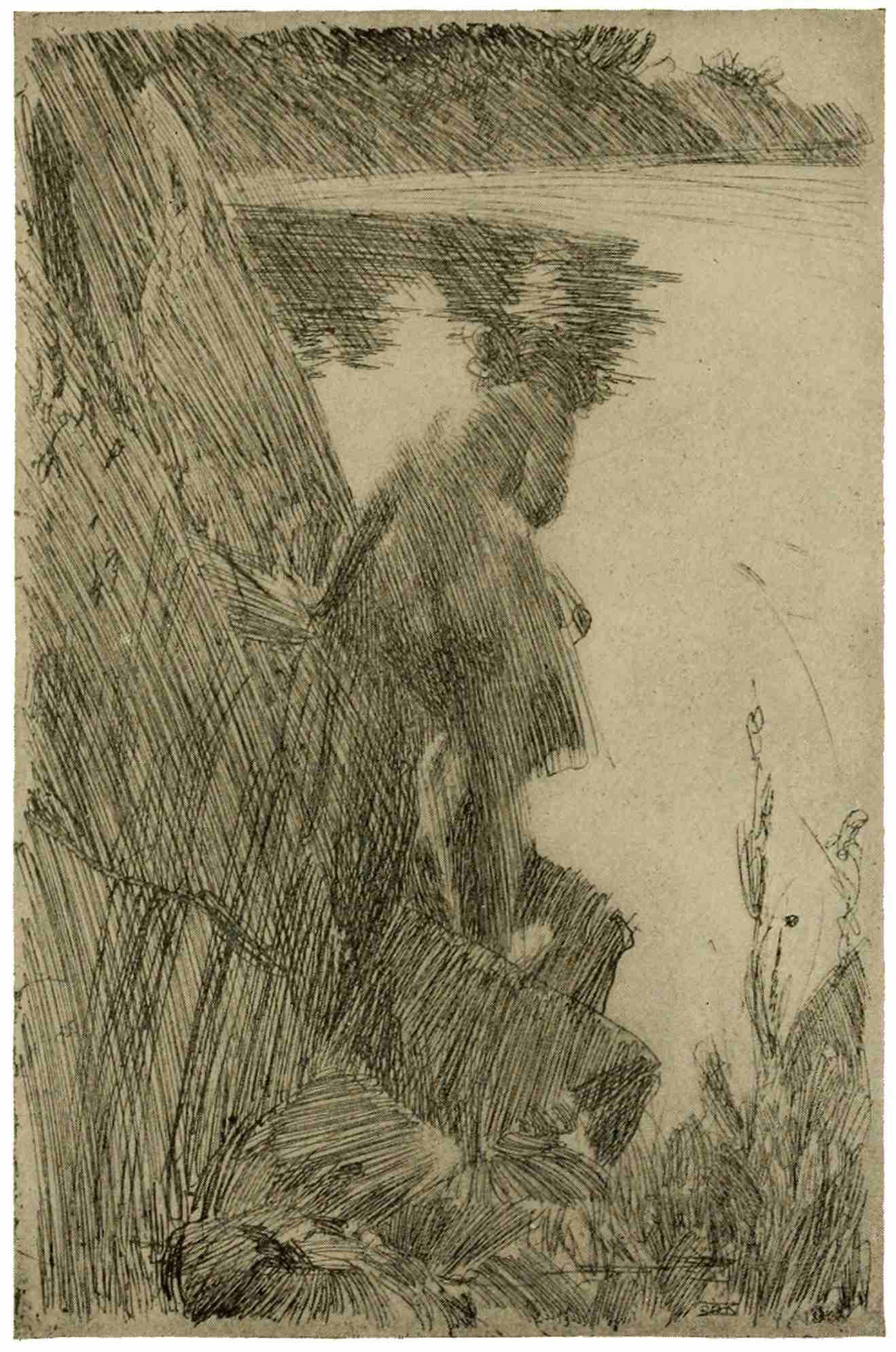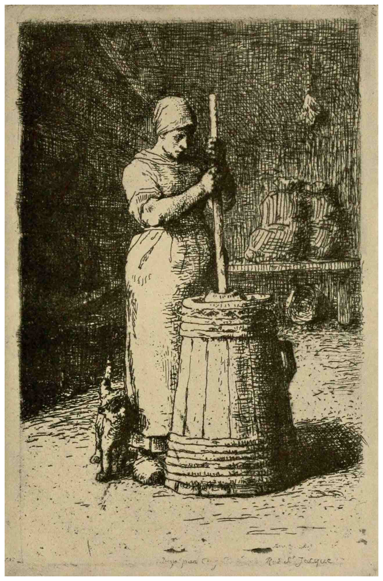 In the forties there is a welcome revival of etching, Charles Jacque being one of the pioneers, skillful alike in his handling of acid and dry-point. His theme is the peasant’s life, his setting the wooded, undulating region about Barbizon: broad, sunny fields, thriving farms, pastures with cattle, sheep, and pigs, for which he shows an especial predilection. The peasant, here, is no longer131 the joyous, carousing, merry being of Ostade’s fancy. In the plates of Millet and Jacque we see him at his daily labors and the woman at her household tasks, as in the “Woman Churning,” by Jean François Millet, drawn in sober, telling lines, and evoking by some subtle magic a sense not only of the scene before us, but of her surroundings and her whole labor-laden life.