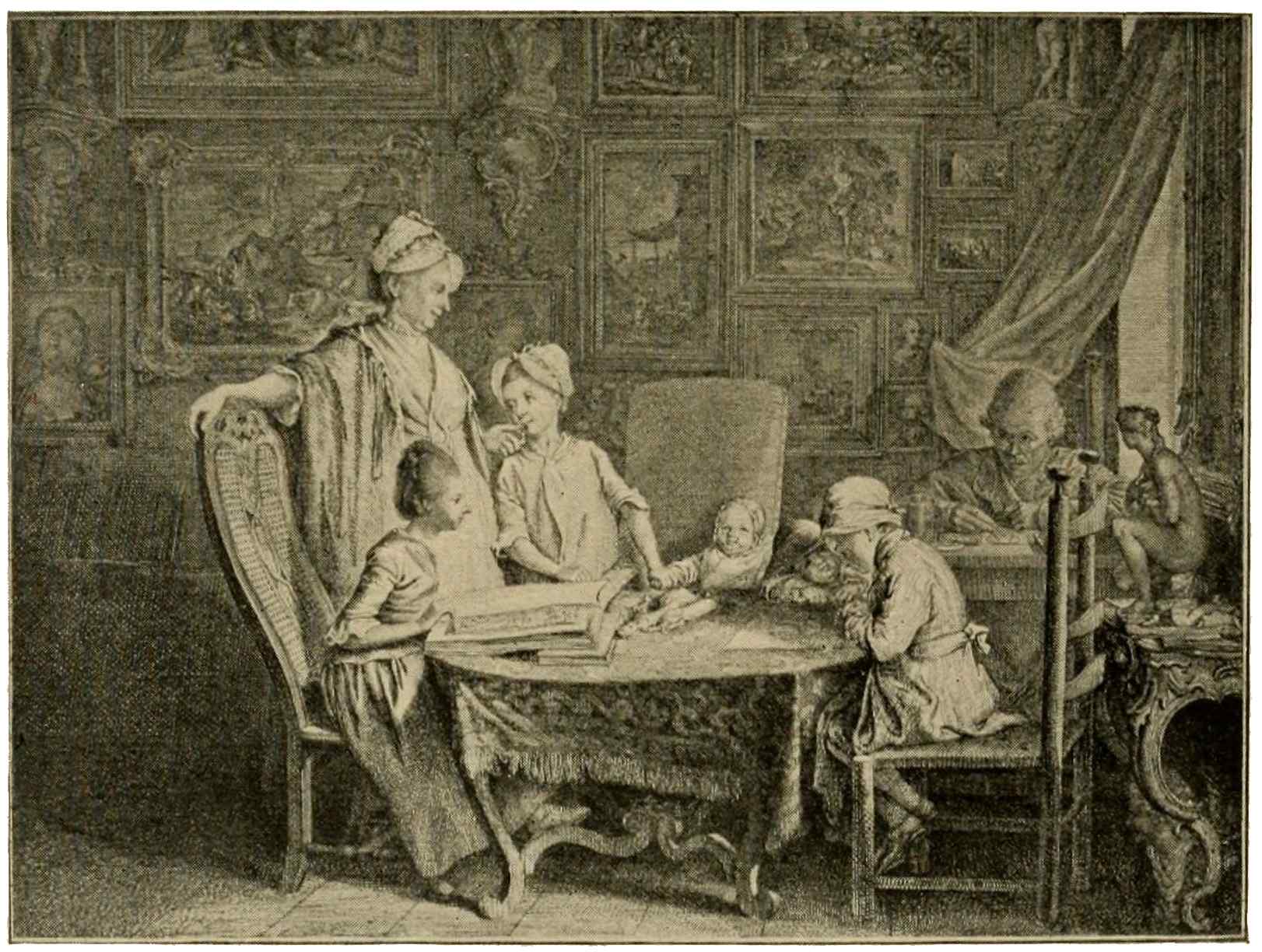 Individuality seems the keynote of the nineteenth century; hence it may be as well not to bind ourselves to headings and subdivisions, but rather to roam at large through this enormous sphere. Goya, of whom we spoke in a preceding chapter, belongs here by right, and with Fortuny forms the Spanish contingent in the new awakening of the graphic arts. In England there lived, about the turn of the century, a visionary poet and great artist, William Blake, who fluently expressed himself in strangely fascinating123 compositions of religious or fantastic import, doubtless familiar to us all. Our concern is not with Blake’s drawings, in which he adds the charm of exquisite color to his command of expressive form. A plate taken from his remarkable series of illustrations to the Book of Job, shows his powerful, poetic conception of the beginning of life, when the world was young and the morning stars sang together. In a totally different way, illustrative of another phase of this same new awakening, the work of Daniel Chodowiecki shows a man concerned with the world which surrounds him. We see him here, at work in the midst of his family, on his little illustrations which went forth in their hundreds to embellish the bountiful stream of German literature.