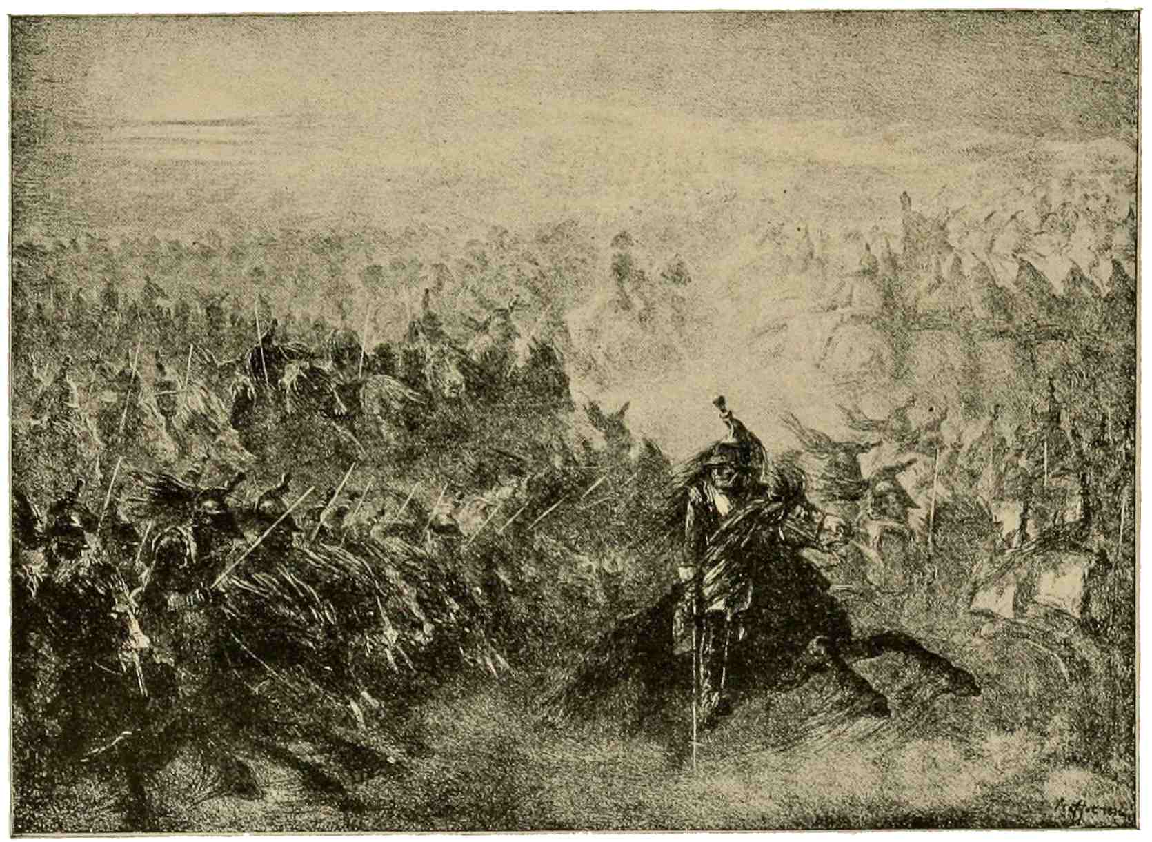 The fortunes of France, fraught with conquest under the first Napoleon, sink to130 humdrum levels with the Restoration. For years all recollection of the Emperor and his Grande Armée is embittered by the final disaster. But passing years restore the luster of former great exploits, and gradually these become a favorite subject for illustration. The field is well covered by Charlet’s military scenes, though none of these approach the grandeur and skill displayed by Auguste Raffet. In his “Midnight Review” we see innumerable hosts of shades, passing in review before the phantom emperor on his white charger; an immense concourse insensibly merging into the mists of night.