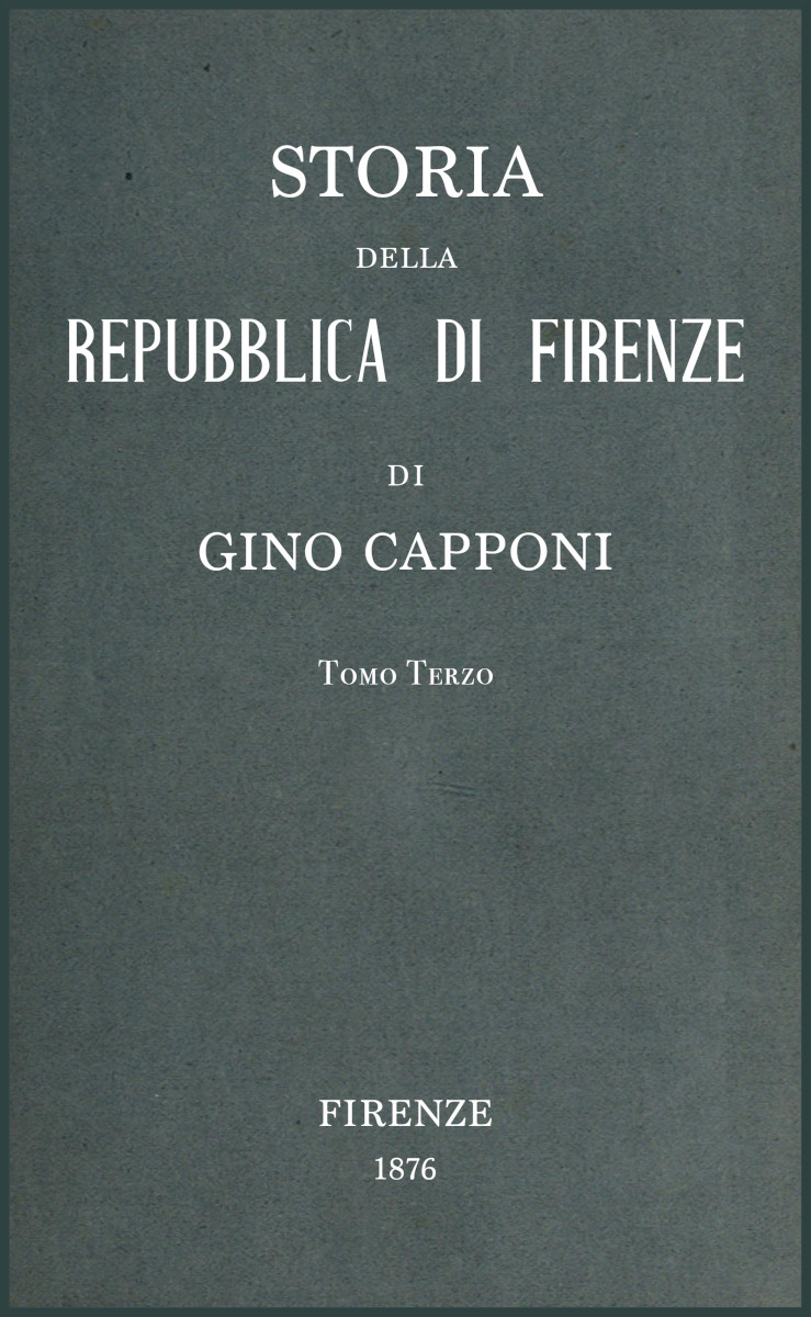 | Mala disposizione contro alla Casa Medici dei maggiori tra gli Ottimati. — In Firenze i giovani chiedono le armi; quindi all’appressarsi [xi] dei due eserciti la città insorge e si dichiara contro ai Medici. Ma essendovi entrati i Capitani della Lega, si fa un compromesso. — Pel caso di Roma i moti crescono in Firenze. Filippo Strozzi e madonna Clarice sua moglie. I due giovani Medici obbligati a partirsi di Firenze. — I popolani armati impongono la riapertura del Consiglio Grande e un Governo com’era nel dodici. — Niccolò Capponi eletto Gonfaloniere per tredici mesi. — La città è divisa tra chi voleva e chi non voleva romperla affatto co’ Medici. — Evasione del Papa. — Feste in Firenze. Rigori contro ai partigiani dei Medici; guardia di giovani al Palagio. — [1528]. Distruzione dell’esercito francese sotto Napoli: finiscono le Bande Nere, che erano al soldo dei Fiorentini. — Andrea Doria, fattosi amico a Carlo V, costituisce in Genova una forma nuova di governo. — I Francesi dopo altre sconfitte abbandonano anche la Lombardia. — Istituzione in Firenze d’una milizia per cui si danno le armi in mano al popolo. Solennità; orazioni che furono recitate. — Sedizione dei giovani che avevano preso la guardia del Palagio. Condanna di Iacopo Alamanni e sua decapitazione. — Ingrossa la parte avversa al Capponi. — Ippolito dei Medici è fatto Cardinale. — Pratiche di Clemente per fare tornare i suoi in Firenze come semplici cittadini. Il Gonfaloniere ascolta queste pratiche. — Una lettera caduta di mano a lui è occasione a destituirlo dal magistrato e farlo mettere in accusa. Viene assoluto in quel giudizio, e torna a casa onorato. Francesco Carducci eletto in sua vece. — Pratiche di pace tra ’l Papa e Cesare. In Firenze i più esperti consigliavano accostarsi a questo. Andrea Doria ne faceva formale proposta e mandava qui a tal fine, ma inutilmente, Luigi Alamanni. — Trattato di Barcellona, pel quale il Papa e Cesare si obbligano a rimettere i Medici in Firenze. — Pace di Cambray: Francesco I promette l’abbandono dei suoi alleati, intanto che egli e la Corte addormentavano l’ambasciatore Baldassarre Carducci di vane promesse. — Moti diversi degli animi in Firenze. — Carlo V a Genova [12 agosto 1529]: nuovo assetto allora dato da lui all’Italia. — Quattro ambasciatori mandati a Cesare, dal quale sono rinviati al Papa. I quattro sono divisi tra loro. È ad essi vietato seguirlo in Piacenza. — L’ambasceria si discioglie, e Niccolò Capponi muore in Castelnuovo di Garfagnana. | |
