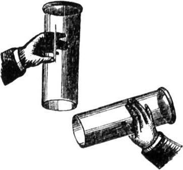 Ich hoffe, das Ihr durch alles dieses eine richtige Vorstellung von dem Gewichte, also auch von der Körperlichkeit[149] der Luft bekommen habt, und wenn ich Euch sage, daß der Kasten dort ein Pfund Luft enthält und dieses Zimmer mehr als eine Tonne, so wird es Euch wohl begreiflich sein, daß die Luft ein ganz gewichtiger Körper ist. Ich will noch ein anderes Experiment zeigen, um Euch ihre Widerstandsfähigkeit darzutun. Die Knallbüchse kennt wohl jeder, die man so leicht aus einem Federkiel oder irgend einer ähnlichen Röhre herstellen kann; aus einem Kartoffel- oder Apfelscheibchen wird mit dem Kiel selbst ein Pfropfen ausgestochen und an das andere Ende hingeschoben, wie ich es hier mache, so daß der Ausgang dicht verschlossen wird; nun steche ich ein zweites Stückchen aus und schiebe es hinein; jetzt ist also die Luft im Innern der Röhre vollständig eingeschlossen, ganz wie wir’s zu unserm Zweck gebrauchen. Nun aber zeigt es sich, daß keine Kraft imstande ist, dieses zweite Pfröpfchen vollständig auf das erste aufzutreiben; das ist eine völlige Unmöglichkeit. Bis zu einem gewissen Grad läßt sich die Luft wohl zusammenpressen, doch lange vor der Berührung der beiden Pfropfen wird die eingezwängte Luft den vorderen Pfropfen mit einem Knall hinaustreiben; die Wirkung ist hier ähnlich wie beim Schießpulver, dessen Kraft zum Teil von denselben Umständen abhängig ist, welche Ihr hier erläutert seht.