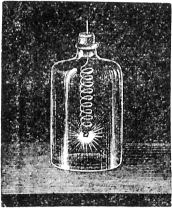 Statt aber so viele einzelne Kohlenstäubchen zu verbrennen, will ich nun lieber ein größeres Stück Kohle benutzen, dessen Gestalt und Umfang Ihr während des Brennens deutlich unterscheiden könnt. Ihr werdet dann auch den ganzen Vorgang besser beobachten.[168] Hier ist das Gefäß mit Sauerstoff, und hier ist ein Stück Kohle, an das ich einen Holzspan befestigt habe; diesen kann ich anzünden und so die Verbrennung einleiten, welche sich sonst nur schwierig bewerkstelligen ließe. Da seht Ihr nun die Kohle brennen, aber nicht mit einer Flamme (oder wenn Ihr doch ein Flämmchen bemerkt, so ist es jedenfalls nur ein ganz kleines; es rührt davon her, daß bei der Verbrennung sich vorübergehend eine eigene Substanz, sogenanntes Kohlenoxyd an der Oberfläche der Kohle bildet). Die Verbrennung geht diesmal langsam vor sich, wie Ihr seht, und nach und nach entwickelt sich Kohlensäure durch die Verbindung der Kohle mit dem Sauerstoff. Hier habe ich ein anderes Stück Kohle, und zwar Borkenkohle, welches die Eigentümlichkeit besitzt, beim Brennen in Stücke zu zerspringen, zu explodieren. Durch die Hitze wird dieser Kohlenklumpen in einzelne Teilchen zerplatzen, die in die Luft fliegen; indes brennt jedes Teilchen ebenso wie die ganze Masse in dieser eigentümlichen Art – es brennt wie eben Kohle brennt, ohne Flamme. Ihr bemerkt, daß eine Menge einzelner kleiner Verbrennungen vor sich gehen, seht aber keine Flammen. Ich kenne kein schöneres Experiment als dieses, um zu zeigen, daß die Kohle nur glimmend brennt.