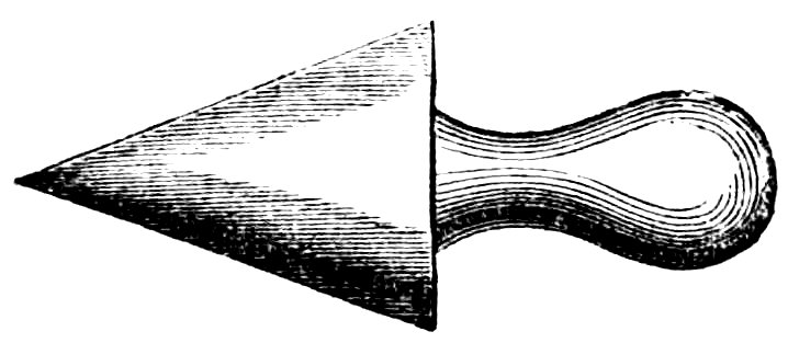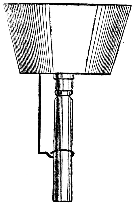 The common plan for filling these cases with composition is simply to put them on the same settle on which quarter-pound tourbillons are rammed, and to drive into the lower end of them about half-an-inch of clay, very solid, and to ram in the composition upon this until it rises to such a height 184as will enable the star to burn as long as the piece or pieces with which it has to keep time. But I think a much better plan is the following:—Procure a turned drift of box, or some hard wood, about five inches long in its straight part, with an end as represented at fig. 113. Put a ladleful of clay into the case when it is upon the settle (the ladle used for filling quarter-pound rockets is meant), and drive down the clay with the conical end of the drift, by which means you will have a hollow clay cone formed in the end of the case. Now ram in your composition, which may be made from either of the following formulas:—