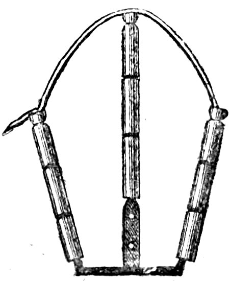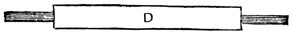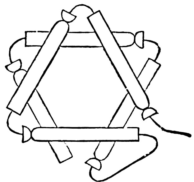 There is also a very pretty fixed piece, of more simple construction than the above, in which you may use three single Saxons. It consists of three Saxons illuminated, and three fixed cases of brilliant fire. A fuze will be found useful in this piece as in the last, but you can do without it here. Connect the three Saxons with leaders; connect also the three fixed cases with leaders, and carry from these another leader to some point where you can conveniently light it with a portfire. Fire the Saxons (which we will suppose are single ones) and let them burn until one end of each is consumed; then fire the fixed cases of brilliant fire, which should each 170have a report at its end. A sketch of the shape of this piece is given at fig. 101.