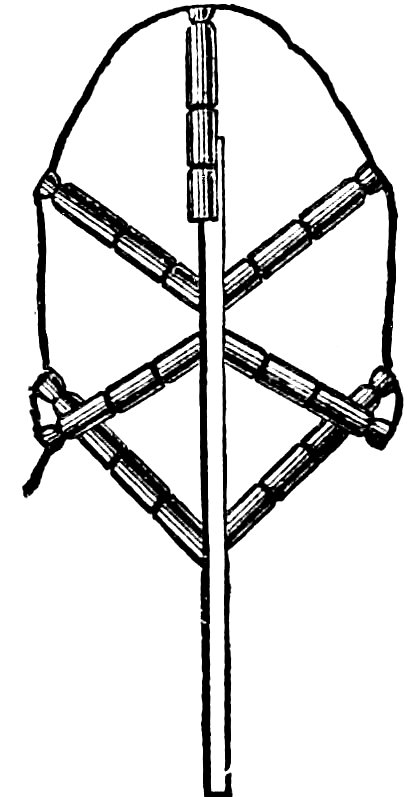For a wheel of four feet in diameter there should be six spokes, to the ends of which is fastened a strong ash or beechwood hoop. There should also be another wooden hoop six inches nearer to the centre of the wheel, as is shown at fig. 115. The pieces with which I have there represented the wheel as fitted up are as follow:—