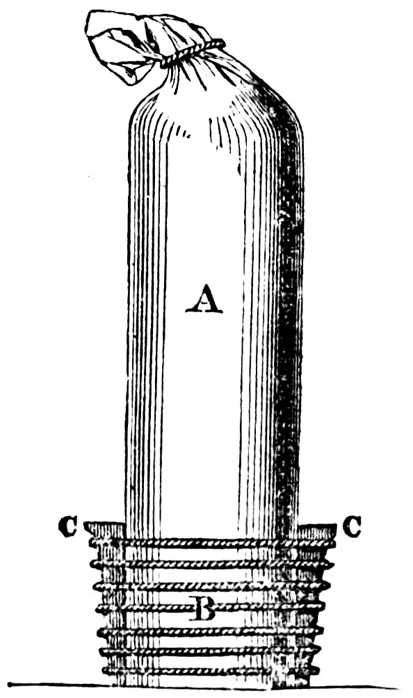 You will now have the three principal parts of the mine ready to put into the pasteboard mortar. In order to do this, take your bundle of serpents and hold them mouths upwards, as represented at fig. 107, and on their mouths lay the primed circle of thin paper, meal-powder side downwards. On this lay the packet of gunpowder, with its smooth side downwards, and its tied side upwards. Then taking the mortar, bottom upwards, pass it over the whole in the way in which an extinguisher is used. The mine, thus far completed, is now to be turned the proper way upwards, and a knife or pair of scissors passed into it to divide the cotton which bound the serpents together. Care must be taken that this little piece of after-work is not forgotten and left undone, otherwise your serpents will come out in a lump, and will not be able to spread.