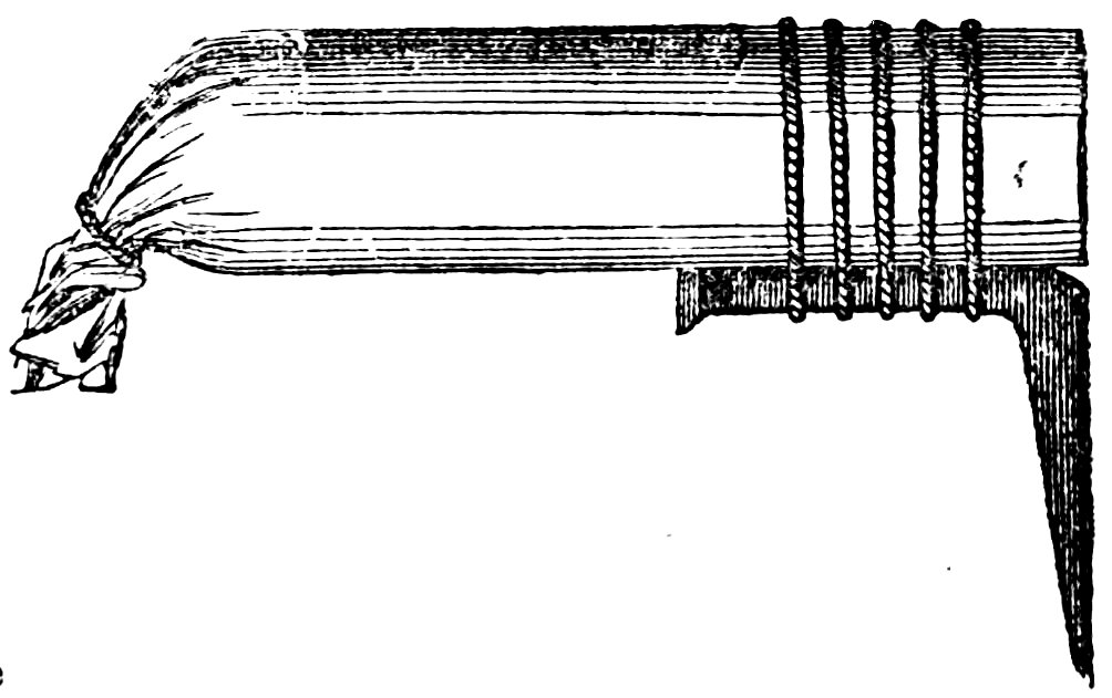 In the next place you must always keep your eye on the look-out for old odd pieces of thick brown paper, or sugar paper, or any thick paper used for parcels, and turn them to account; any old pieces of cardboard may also be worked in. You will want a case or mortar seven inches long, and so well pasted and closely rolled that you can hardly bend it with your fingers. Do not spare the paste, nor imagine that you can dispense with the roller board. Well paste the former and all the paper, and when you have finished the mortar, set it by, and do not use it till it is thoroughly dry and hard, but at the same time do not attempt to hurry the drying over, and so warp it and put it out of shape.
