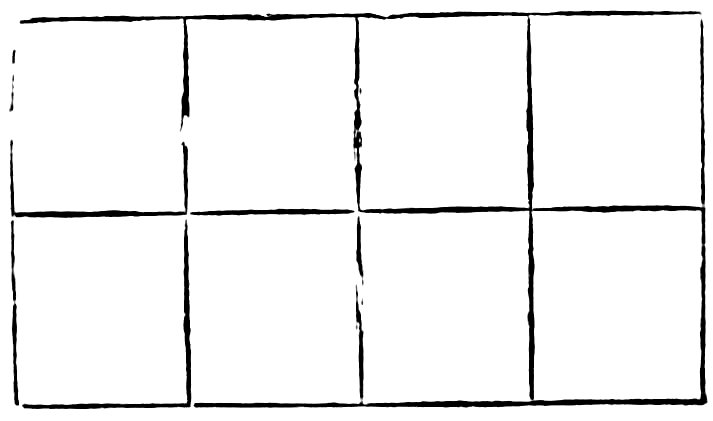 69. The cases are made upon the same “former” on which the quarter-pound rocket-cases are rolled. They consist of a piece of 70-lb. brown paper and a piece of imperial board. The sheet of brown paper is cut into strips, as represented in the annexed diagram, by which it will be seen that each sheet furnishes enough paper for six cases. The imperial board should be divided, as shown in the following sketch, 112, into twelve equal strips—thus: so that two sheets of 70-lb. brown paper and one of imperial board will give material for one dozen cases for five-pointed stars. The paper and board must be well pasted, and the rolling board used unsparingly, as cases for this purpose cannot be too strong and hard.