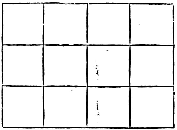 We now come to the last page of illustrations, where is described a set-piece known by the name of the lattice-work piece (fig. 121). This may be made either with 24 brilliant reported fixed cases and 6 coloured fires, or with 36 fixed cases and 9 coloured fires. The sketch is made to represent the arrangement as it should be for 36 cases and 9 colours. If used with only 24 cases, and 6 colours or five-pointed stars, it will be a large piece, and quite effective enough for a display of ordinary pretensions. It is made by fastening brilliant reported fixed cases to squares of wood, and fixing these squares at equal distances from one another, so that the fire from the cases represents lattice-work.