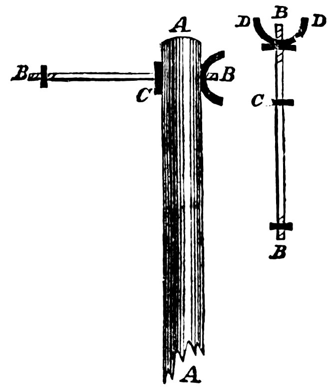 In the first place there is the large vertical wheel, the frame of which is described at fig. 115. This should be not less than four feet in diameter, and should turn on an iron spindle made of three-eighths of an inch rod. The following is a good useful sort of spindle for large wheels (fig. 116), being very steady and easily fixed to your post. AA represents the post, which should be ten feet out of the ground. BB represents the spindle, which has an iron collar at C and a large thumbscrew at DD. The collar is fixed to the spindle, and is placed against the face of the post. The thumbscrew is screwed up tightly at the back of the post, and keeps the spindle firmly in position. The other end of the spindle may be “tapped” for a short distance, and have a small “nut” to fit it, in order to keep the wheel from working off; this, however, is not of much importance, as a piece of cork tied on will do as well.