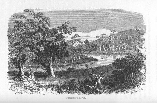 "On my arrival in Adelaide from my last journey I found a great deal of anxiety felt as to whether a line could be carried across to the mouth of the Adelaide river. There would be a few difficulties in the way, but none which could not be overcome and made to repay the cost of such an undertaking. The first would be in crossing from Mr. Glen's station to Chambers Creek, in finding timber sufficiently long for poles, supposing that no more favourable line than I travelled over could be adopted, but I have good reason for supposing that there is plenty of suitable timber in the range and creek, not more than ten miles off my track: the distance between the two places is one hundred miles. From Chambers Creek through the spring country to the Gap in Hanson Range the cartage would be a little farther, in consequence of the timber being scarce in some places. There are many creeks in which it would be found, but I had not time to examine them in detail. Another difficulty would be in crossing the McDonnell Range, which is rough and ragged, but there is a great quantity of timber in the Hugh; the distance to this in a straight line is not more than seven miles; from thence to the Roper River there are a few places where the cartage might be from ten to twenty miles, that is in crossing the plains where only stunted gum-trees grow, but tall timber can be obtained from the rising ground around them. From latitude 16 degrees 30 minutes south to the north coast, there would be no difficulty whatever, as there is an abundance of timber everywhere. I am promised information, through the kindness of Mr. Todd, of the Telegraph department, as to the average cost of establishing the lines through the outer districts of this colony, and it is my intention to make a calculation of the cost of a line on my route, by which the comparative merits and expense will be tested, and I am of opinion I shall be able to show most favourable results. I should have been glad for this information to have accompanied my works, but I find I cannot postpone them longer for that purpose, as parties have already taken advantage of the delay occasioned by my illness at the time of, and since, my arrival home to collect what scraps of information they could obtain, with the intention of publishing them as my travels. I leave the reward of such conduct to a discriminating public; I shall not fail to carry out my intention with regard to a Telegraph line; and should I have no opportunity of submitting it to the public, I shall take care to advance the matter in such channels as may be most likely to lead to a successful issue. I beg reference to my map accompanying this work, which will at once show the favourable geographical situation of the Adelaide River for a settlement, and the short and safe route it opens up for communication and trading with India: indeed when I look upon the present system of shipping to that important empire, I cannot over-estimate the advantages that such an extended intercourse would create."