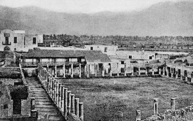 You will pass a ruined temple of Apollo with standing columns and lonely altar and steps that lead to a room that is gone. A little farther on you will come out into a large open paved space. It is the forum. This used to be the busiest place in all Pompeii. At certain hours of the day it was filled with little tables and with merchants calling out and with gentlemen and slaves buying good's. But now it is empty and very still. Around the sides a few beautiful columns are yet standing with carved marble at the top connecting them. But others lie broken, and most of them are gone entirely. This is all that is left of the porches where men used to walk and talk of business and war and politics and gossip.