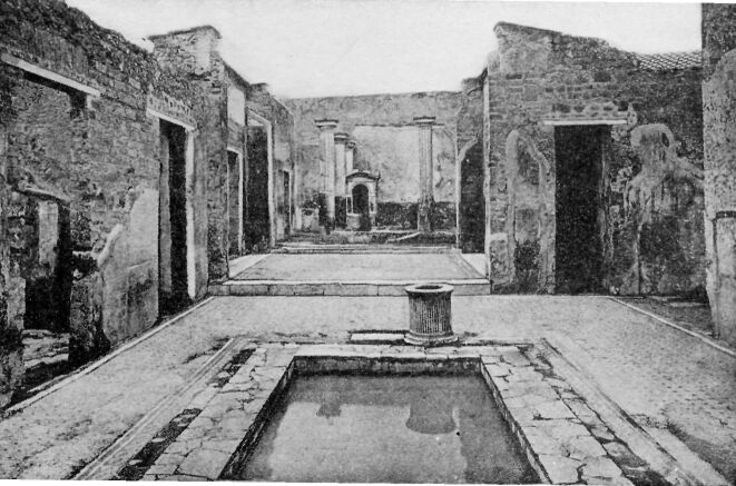 A garden like this, not generally so large, was laid out inside every important house in Pompeii. The family rooms surrounded it. These rooms received most of their light and air from this garden. Caius was lying on a couch in a garden like this, when the shower of pebbles suddenly began. Ariston was painting the walls of a room that overlooked the garden.