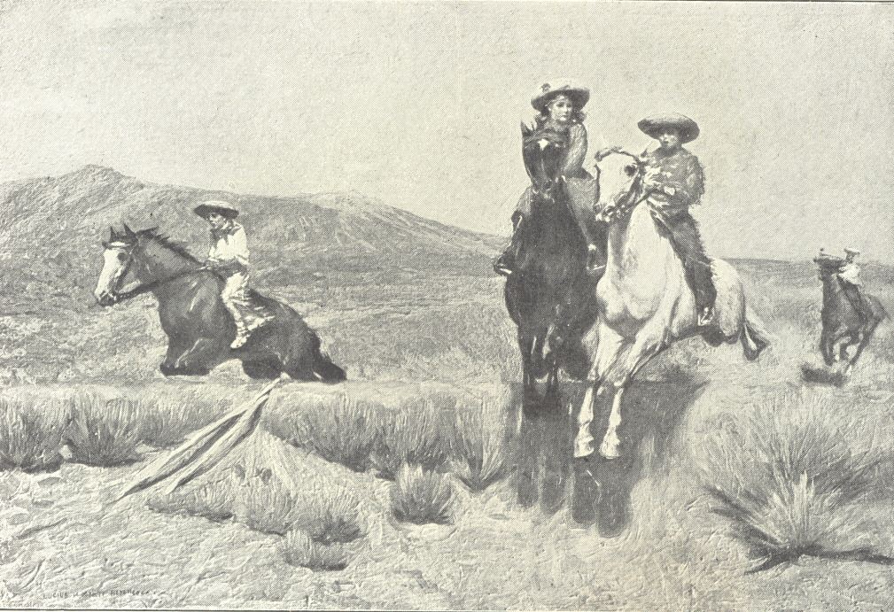 At the point which I had reached in a preceding paragraph of this account, the situation was as follows: two horses lay dying; the bull had scattered his persecutors for the moment, and stood raging, panting, pawing the dust in clouds over his back, when the man that had been wounded returned to the ring on a remount, a poor blindfolded wreck that yet had something ironically military about his bearing—and the next moment the bull had ripped him open and his bowls were dragging upon the ground: and the bull was charging his swarm of pests again. Then came pealing through the air a bugle-call that froze my blood—“It is I, Soldier—come!” I turned; Cathy was flying down through the massed people; she cleared the parapet at a bound, and sped towards that riderless horse, who staggered forward towards the remembered sound; but his strength failed, and he fell at her feet, she lavishing kisses upon him and sobbing, the house rising with one impulse, and white with horror! Before help could reach her the bull was back again—