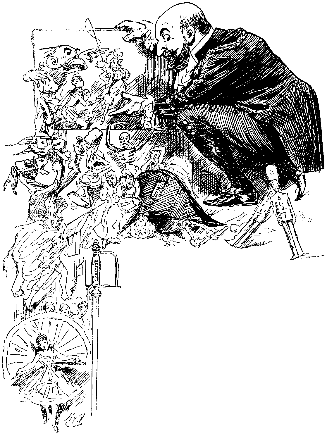 Drury Lane Pantomime commences at 7.30, and is not over till 11.30, and yet in these four hours there rarely comes over you any sense of weariness, except perhaps when the ballets are too long. From first to last the audience is expecting something, and is ready to accept every transition from one scene to another as a change for the better. Mr. HARRY NICHOLLS and Mr. HERBERT CAMPBELL are, of course, funny to look at as the conventional proud sisters; only, as they admit in one of their duets, "it's been done before," in Cinderella, for example; and, by the way, in choosing this subject of Beauty and the Beast, all resemblance between the two stories should have been got rid of, as, up to the Ball Scene, except for the absence of the Pumpkin and the Mice, it is difficult to distinguish between the two fairy tales. But, when last I saw Cinderella, wasn't ROSINA VOKES the sprightly heroine, and her brother with the wonderful legs the Baron? I think so: but I will not be too much of a laudator temporis acti, and will be thankful that one of the youthful Commissioners thoroughly enjoyed this Pantomime, though he was not absolutely certain as to what might be the effect of ghosts and skeletons on his very little brother, aged five or six, if he were brought to see this show. For my part, had I at an early age seen these skeletons which pervade the piece, and of whom two become elongated ghosts, I should have lain awake o' nights, seen horrible reproductions on the wall by the glimmer of the fire-light (spectral rush-lights were used when I was a small boy), screamed for help, and perhaps given my own private and practical version of the Ghost Scene in Richard the Third by not leaping out of bed and shouting, "Give me another horse!" (there was only one in the nursery, and that was a towel-horse), but by putting my head under the bed-clothes and shivering with fear till my nurse returned from her supper. Such on me, your present brave First Commissioner of Theatres, was the effect of merely seeing the interior of the Blue Chamber in Skelt's Scenes and Characters, with which I used to furnish my small theatre on the nursery table.