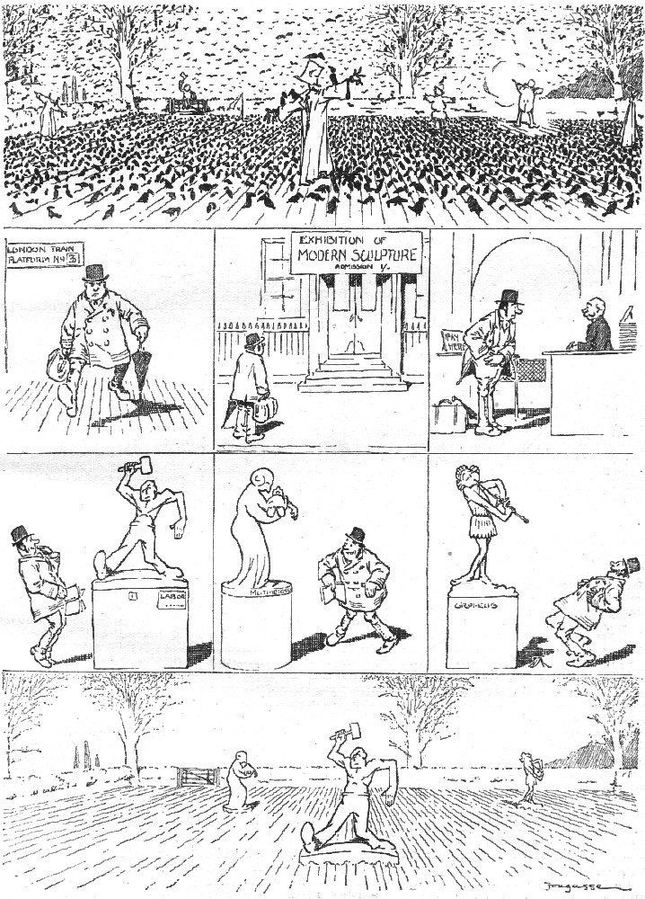 The Hewetsons, who live in London and can enjoy all these opportunities for improvement and still have time for Mr. Robey and the rest, think me a terrible Philistine. But, as I pointed out to Hewetson, he suffers just as acutely when he has a holiday and goes to Paris. Hewetson holds that there is only one theatre in Paris, the Variétés. But by the time he has accompanied Mrs. H. to the Français, the Opéra, the Opéra Comique and the Odéon, to say nothing of the Théâtre des Arts, he is due back at the office. When I explained this to him, his whole attitude changed at once, and he implored me to accept his subscription for shares in my company. But his heart-rending account of his last visit to Paris, before the War, when he and Mrs. H. spent two days hunting round the Louvre (Musée) under the impression that the Rodins were kept there, suggested a wider scope for my schemes, and it seemed to me that the only fair way of acknowledging this was to make Hewetson a director.