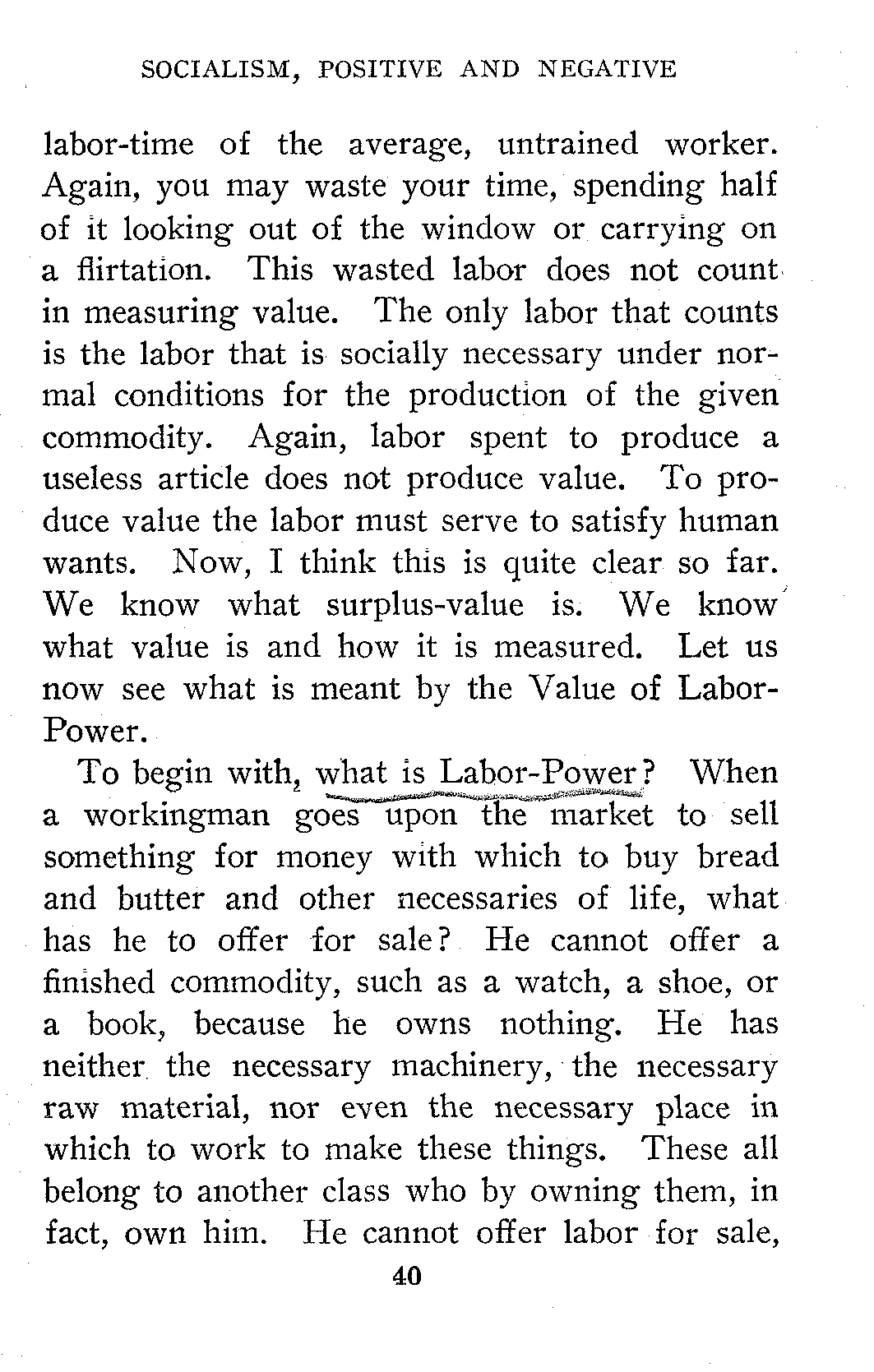 We Marxians are often accused of neglecting the intellectual factor and, as Deville says, a[33] whole syndicate of factors; but we do not neglect them. We recognize their existence and their importance, but we do refuse to waste our revolutionary energy on derivative phenomena when we are able to see and recognize the decisive, dominant factor, the economic factor. As Deville says, we do not neglect the cart because we insist upon putting it behind the horse instead of in front of or alongside of him, as our critics would have us do. Now, if the economic factor is the basic factor, it behooves us to understand the present economic system—Marx's Law of Surplus-Value is the key to this system.