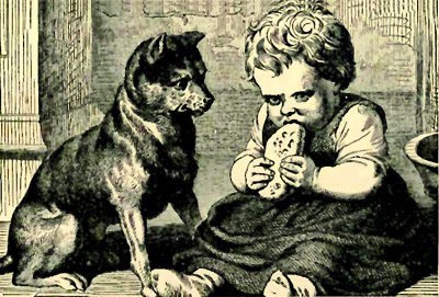 "There," said Kate, a few min-utes [35–36] la-ter, "there is a dog that is not go-ing to be driv-en by a cat. Just look, mam-ma, he wants to get some of that ba-by's sup-per." Mam-ma looked up, and on the porch of a house saw just what you see in this pic-ture—a fat small boy with a slice of bread and but-ter, while a dog al-most as big as the boy looked on wait-ing for a bite.