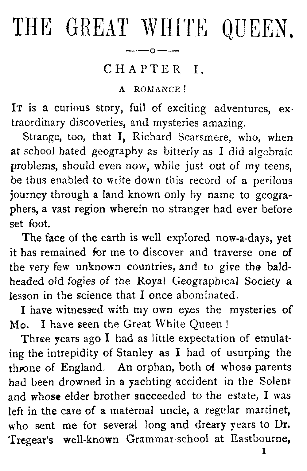 Strange, too, that I, Richard Scarsmere, who, when at school hated geography as bitterly as I did algebraic problems, should even now, while just out of my teens, be thus enabled to write down this record of a perilous journey through a land known only by name to geographers, a vast region wherein no stranger had ever before set foot.
