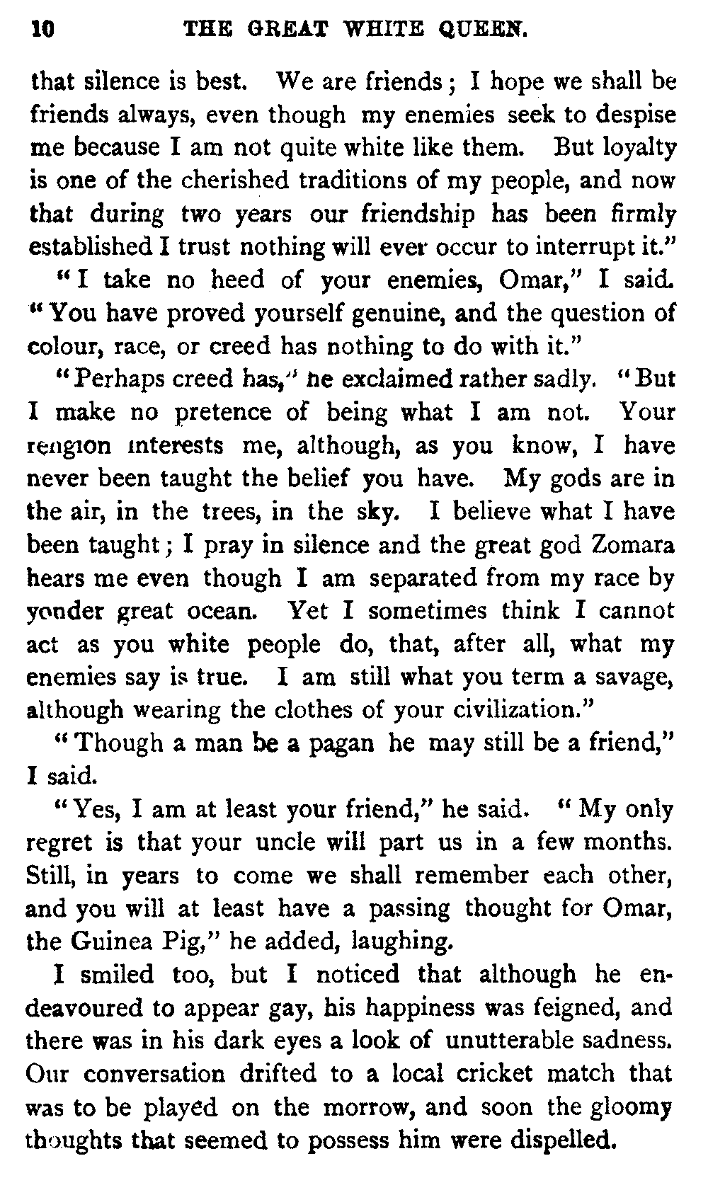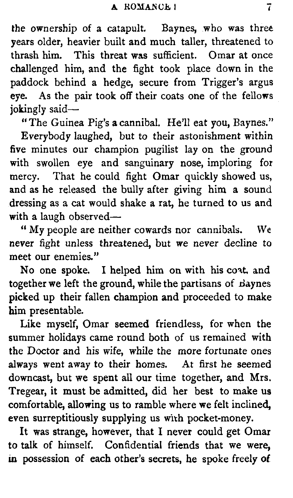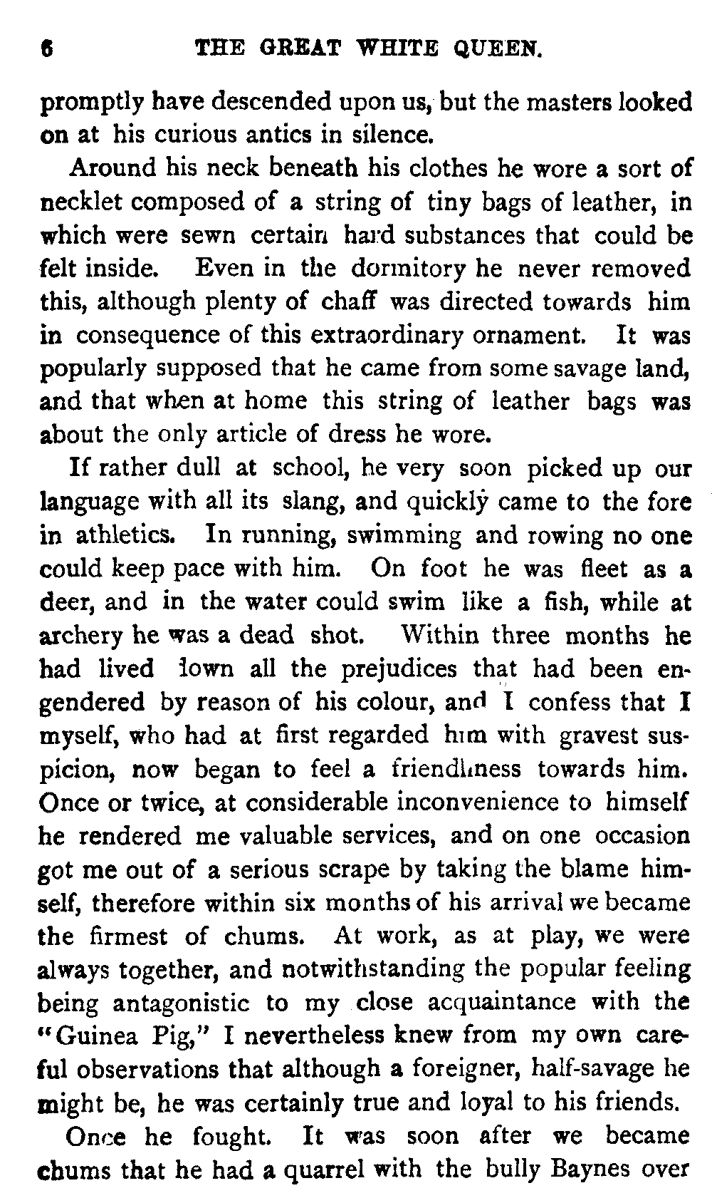 If rather dull at school, he very soon picked up our language with all its slang, and quickly came to the fore in athletics. In running, swimming and rowing no one could keep pace with him. On foot he was fleet as a deer, and in the water could swim like a fish, while at archery he was a dead shot. Within three months he had lived down all the prejudices that had been engendered by reason of his colour, and I confess that I myself, who had at first regarded him with gravest suspicion, now began to feel a friendliness towards him. Once or twice, at considerable inconvenience to himself he rendered me valuable services, and on one occasion got me out of a serious scrape by taking the blame himself, therefore within six months of his arrival we became the firmest of chums. At work, as at play, we were always together, and notwithstanding the popular feeling being antagonistic to my close acquaintance with the "Guinea Pig," I nevertheless knew from my own careful observations that although a foreigner, half-savage he might be, he was certainly true and loyal to his friends.