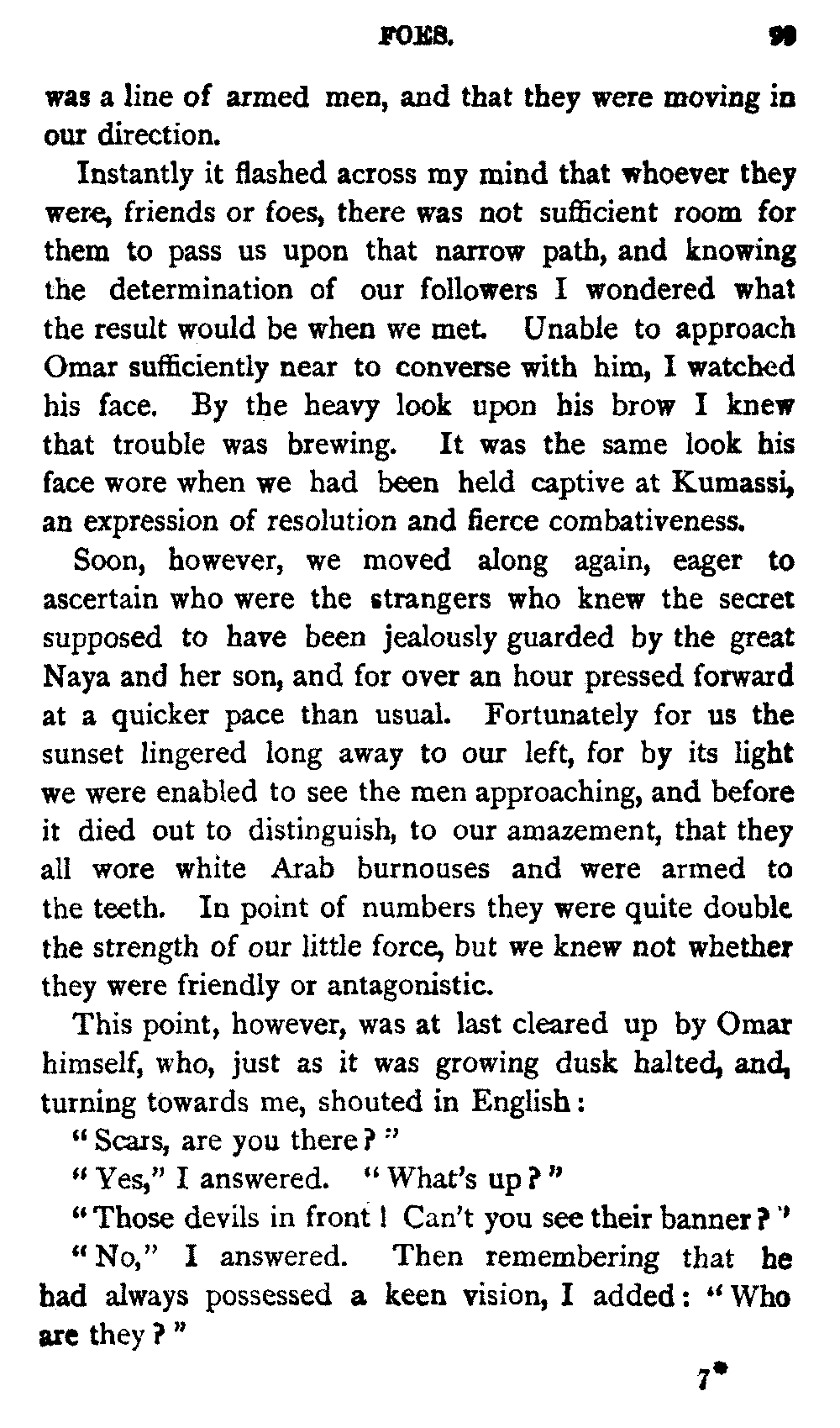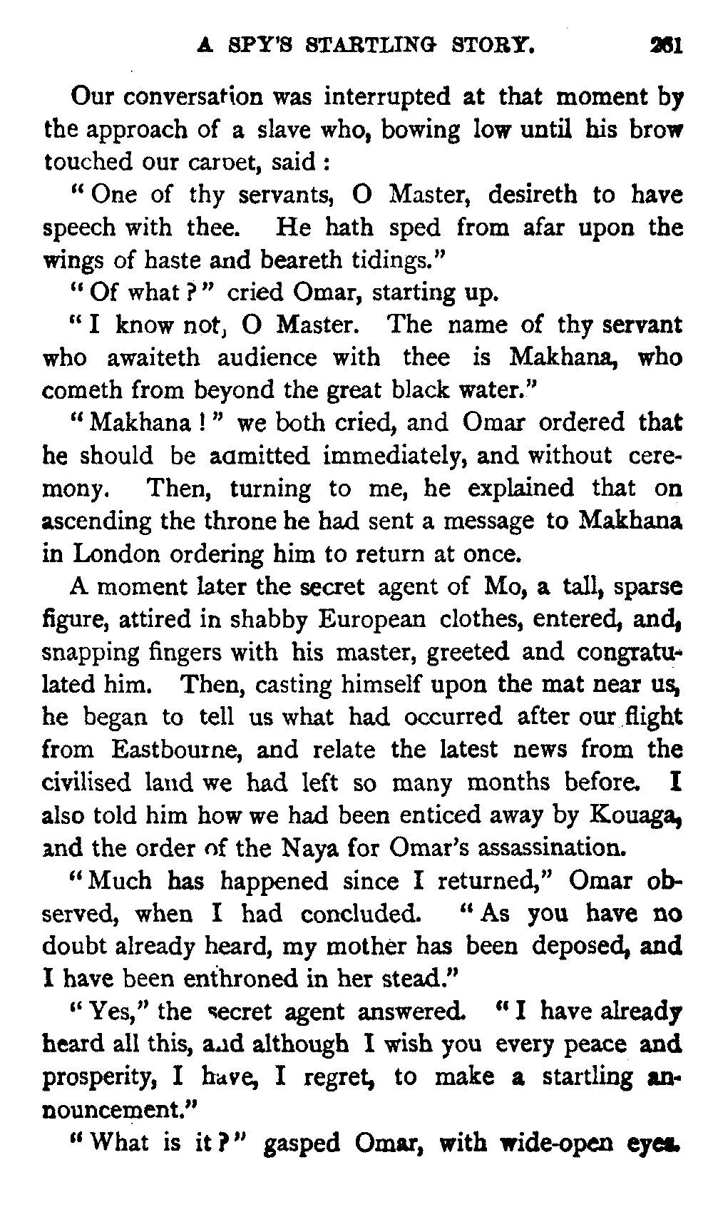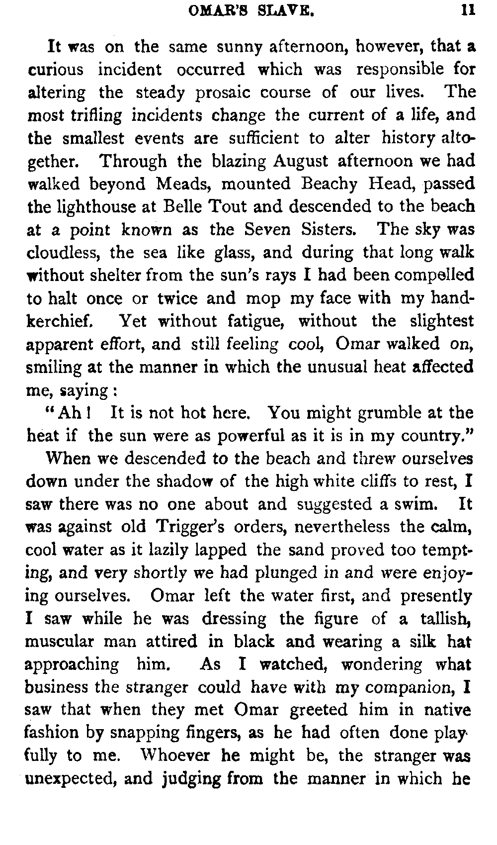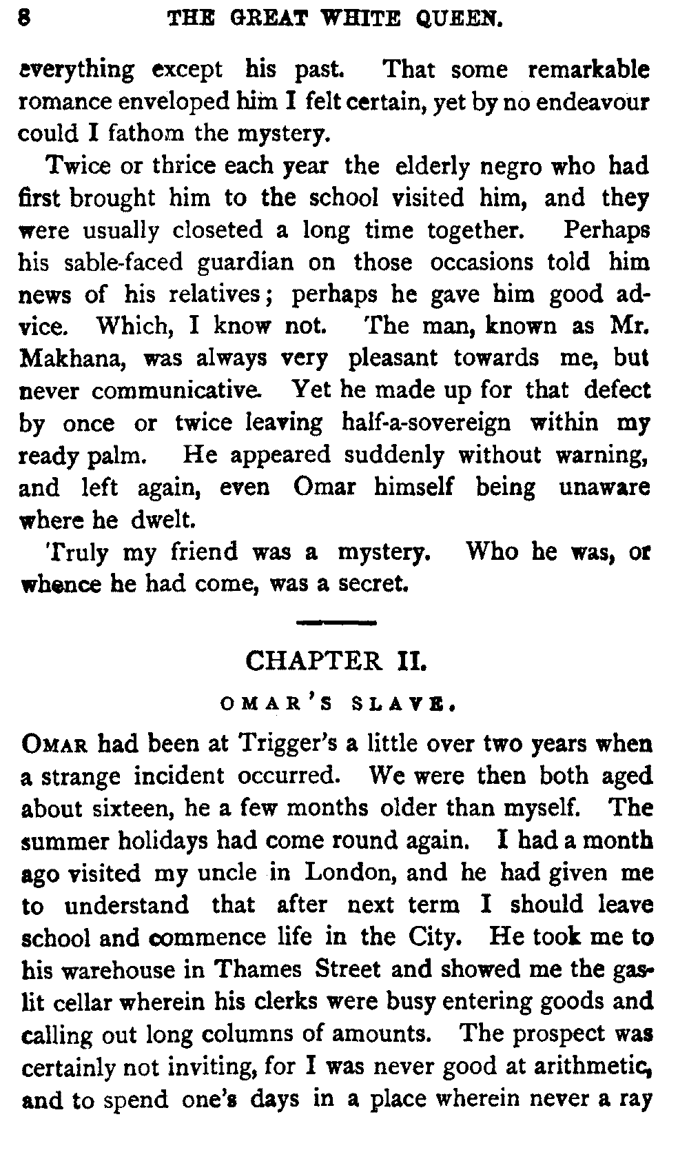 Twice or thrice each year the elderly negro who had first brought him to the school visited him, and they were usually closeted a long time together. Perhaps his sable-faced guardian on those occasions told him news of his relatives; perhaps he gave him good advice. Which, I know not. The man, known as Mr. Makhana, was always very pleasant towards me, but never communicative. Yet he made up for that defect by once or twice leaving half-a-sovereign within my ready palm. He appeared suddenly without warning, and left again, even Omar himself being unaware where he dwelt.