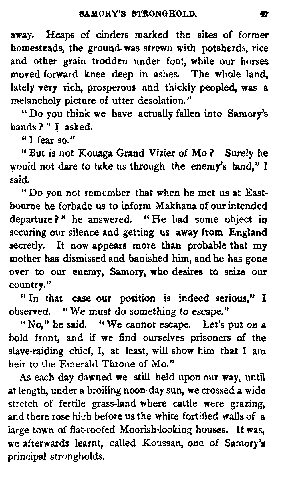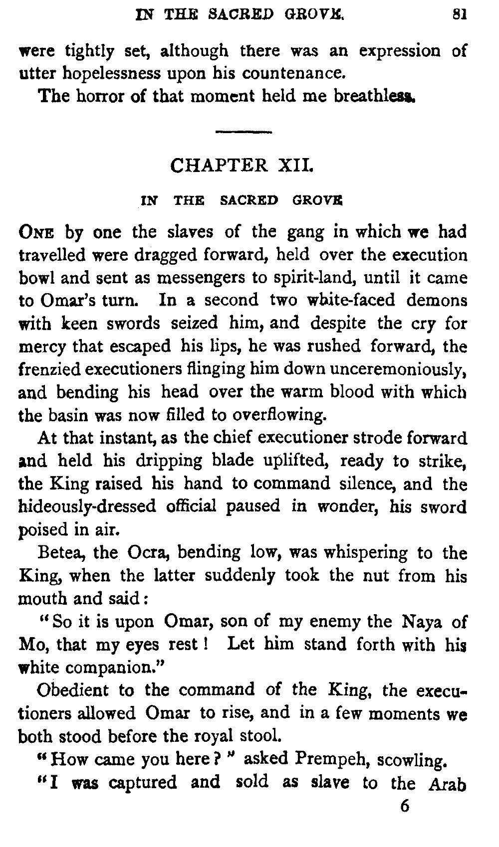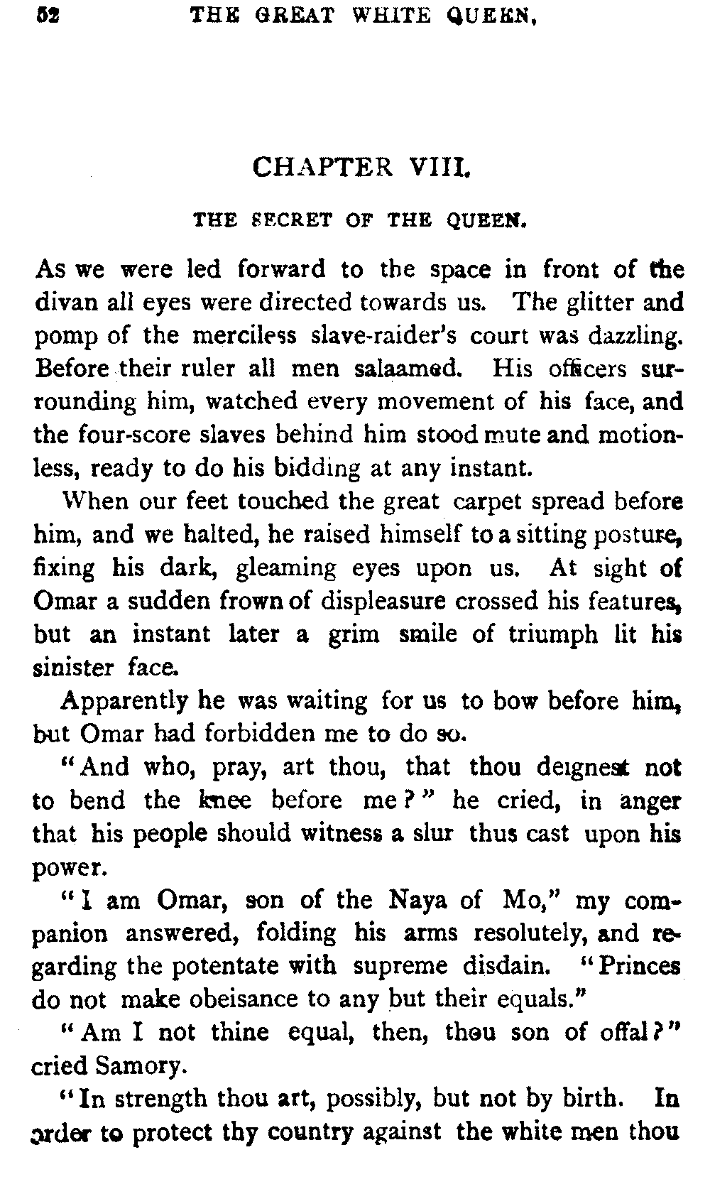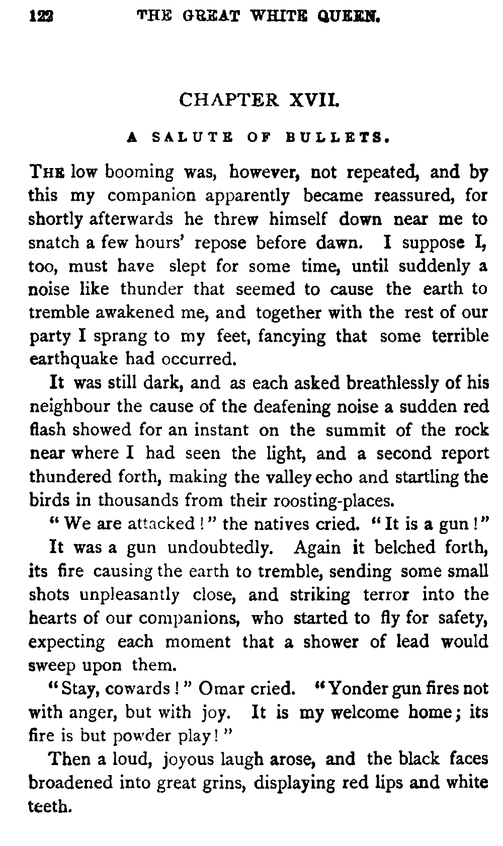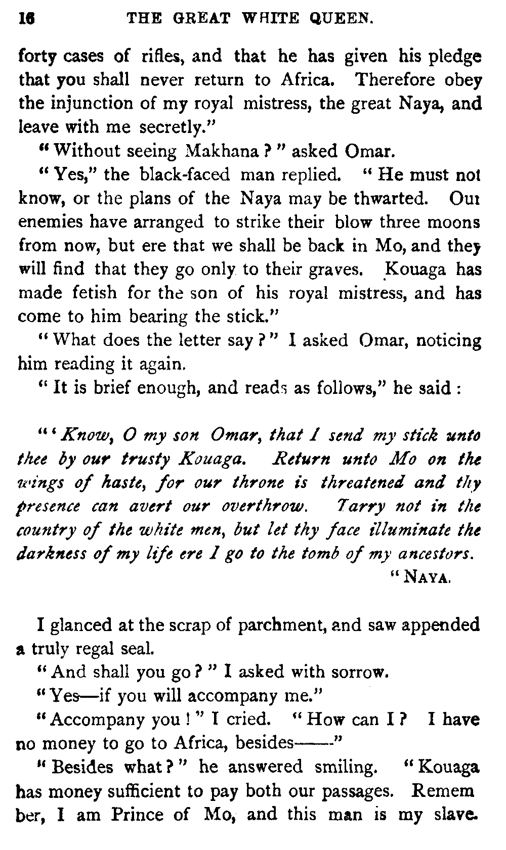 Twice or thrice each year the elderly negro who had first brought him to the school visited him, and they were usually closeted a long time together. Perhaps his sable-faced guardian on those occasions told him news of his relatives; perhaps he gave him good advice. Which, I know not. The man, known as Mr. Makhana, was always very pleasant towards me, but never communicative. Yet he made up for that defect by once or twice leaving half-a-sovereign within my ready palm. He appeared suddenly without warning, and left again, even Omar himself being unaware where he dwelt.