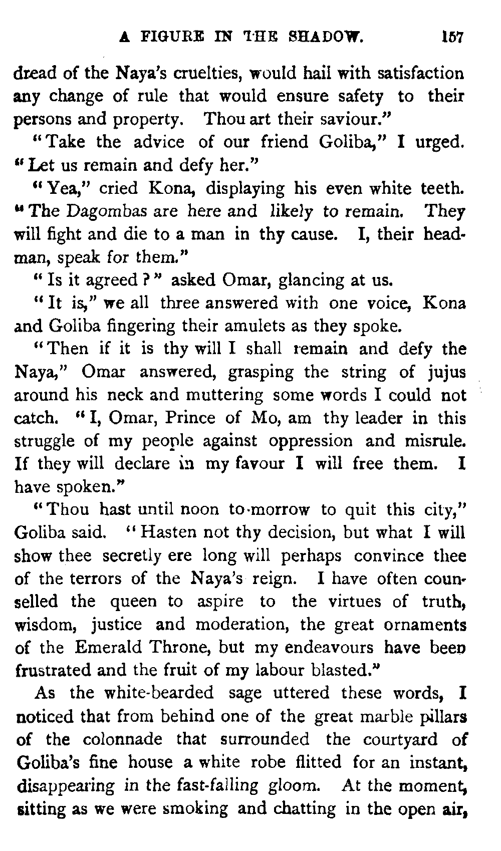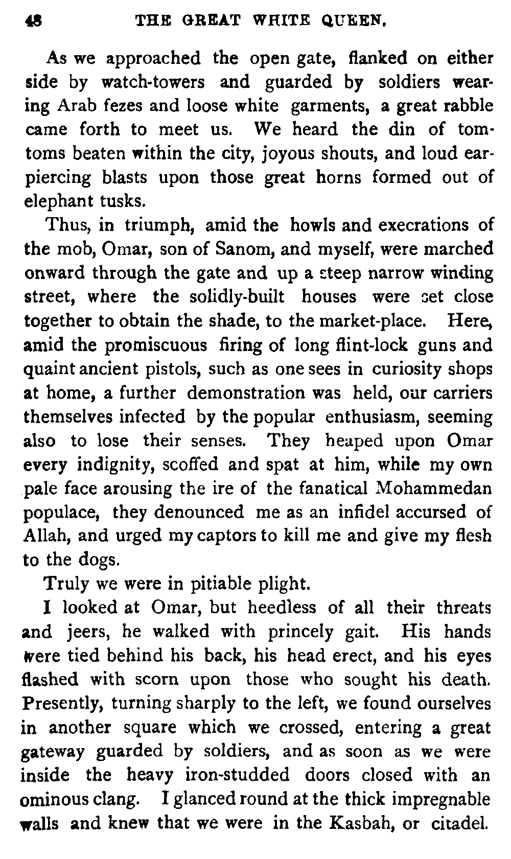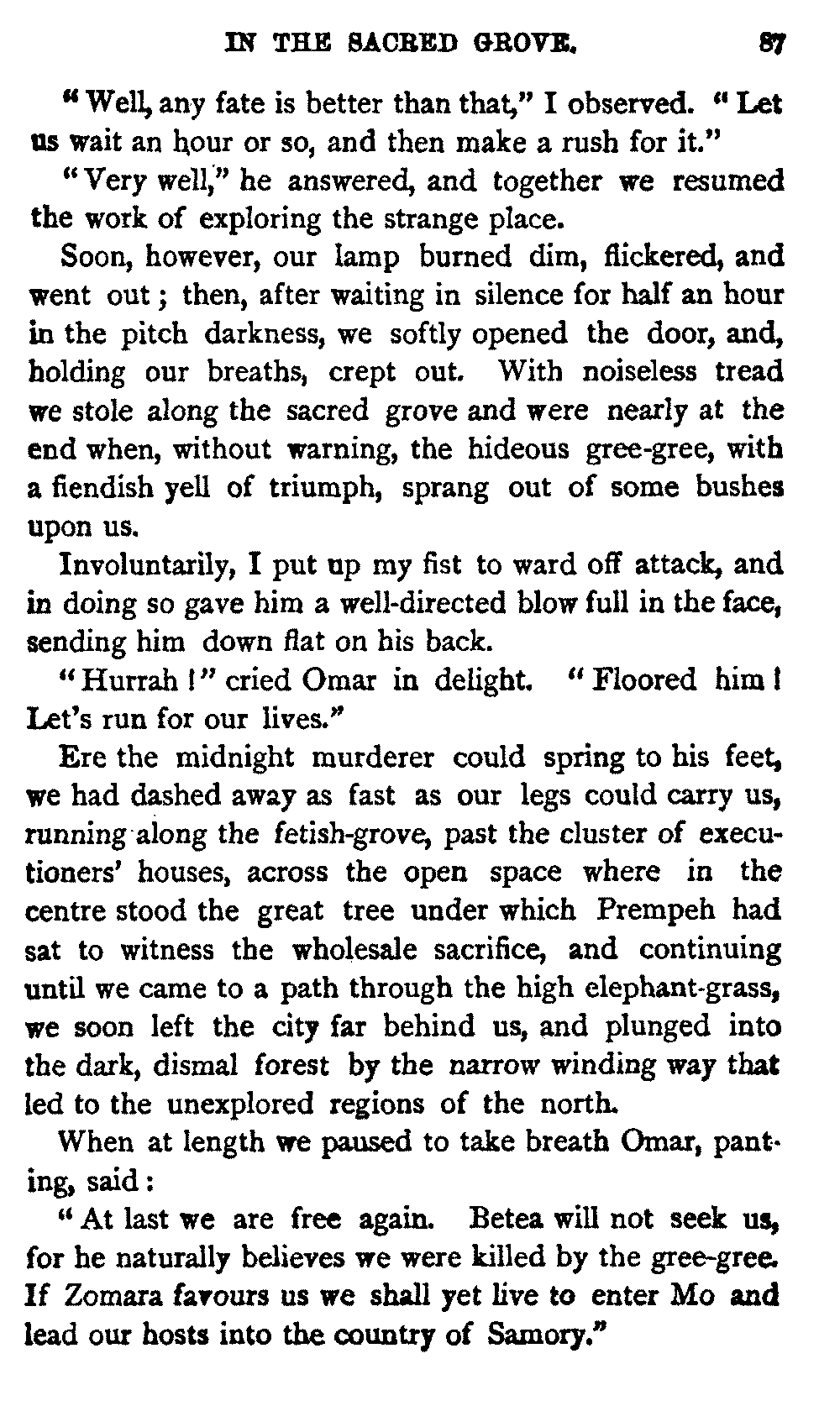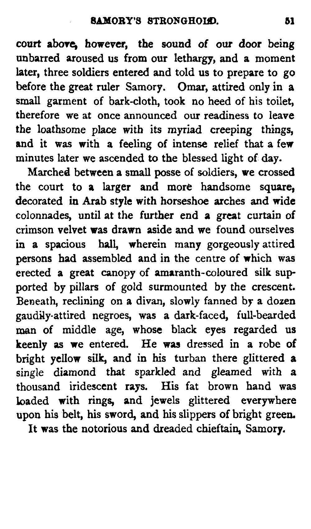 Twice or thrice each year the elderly negro who had first brought him to the school visited him, and they were usually closeted a long time together. Perhaps his sable-faced guardian on those occasions told him news of his relatives; perhaps he gave him good advice. Which, I know not. The man, known as Mr. Makhana, was always very pleasant towards me, but never communicative. Yet he made up for that defect by once or twice leaving half-a-sovereign within my ready palm. He appeared suddenly without warning, and left again, even Omar himself being unaware where he dwelt.