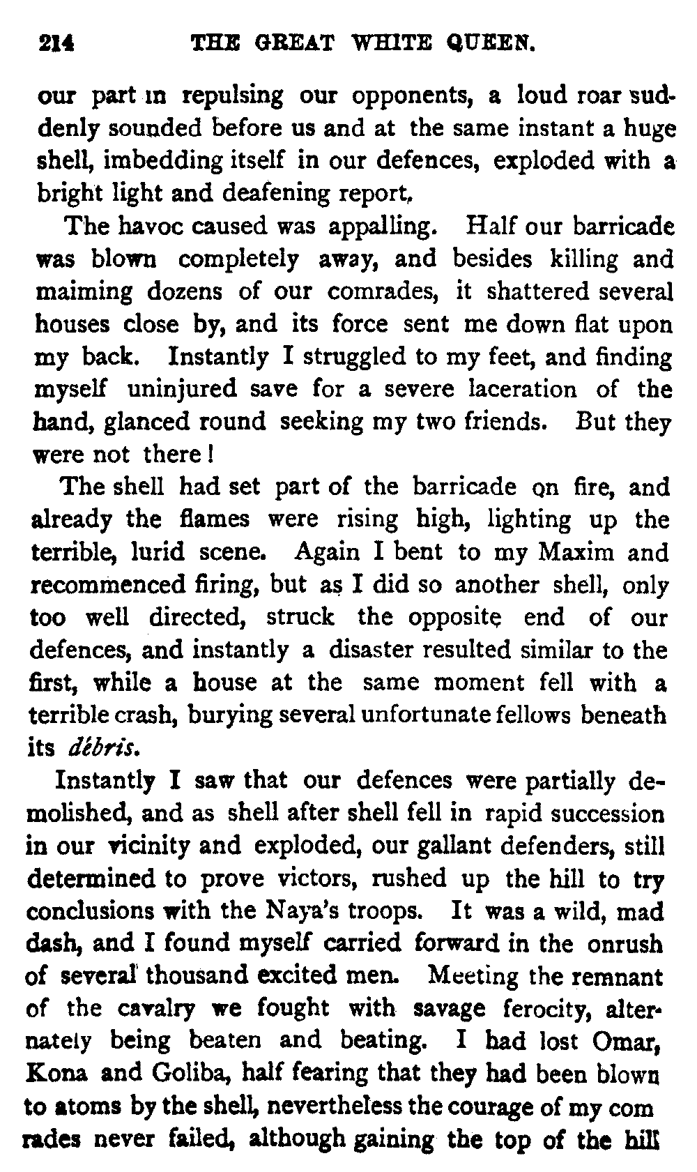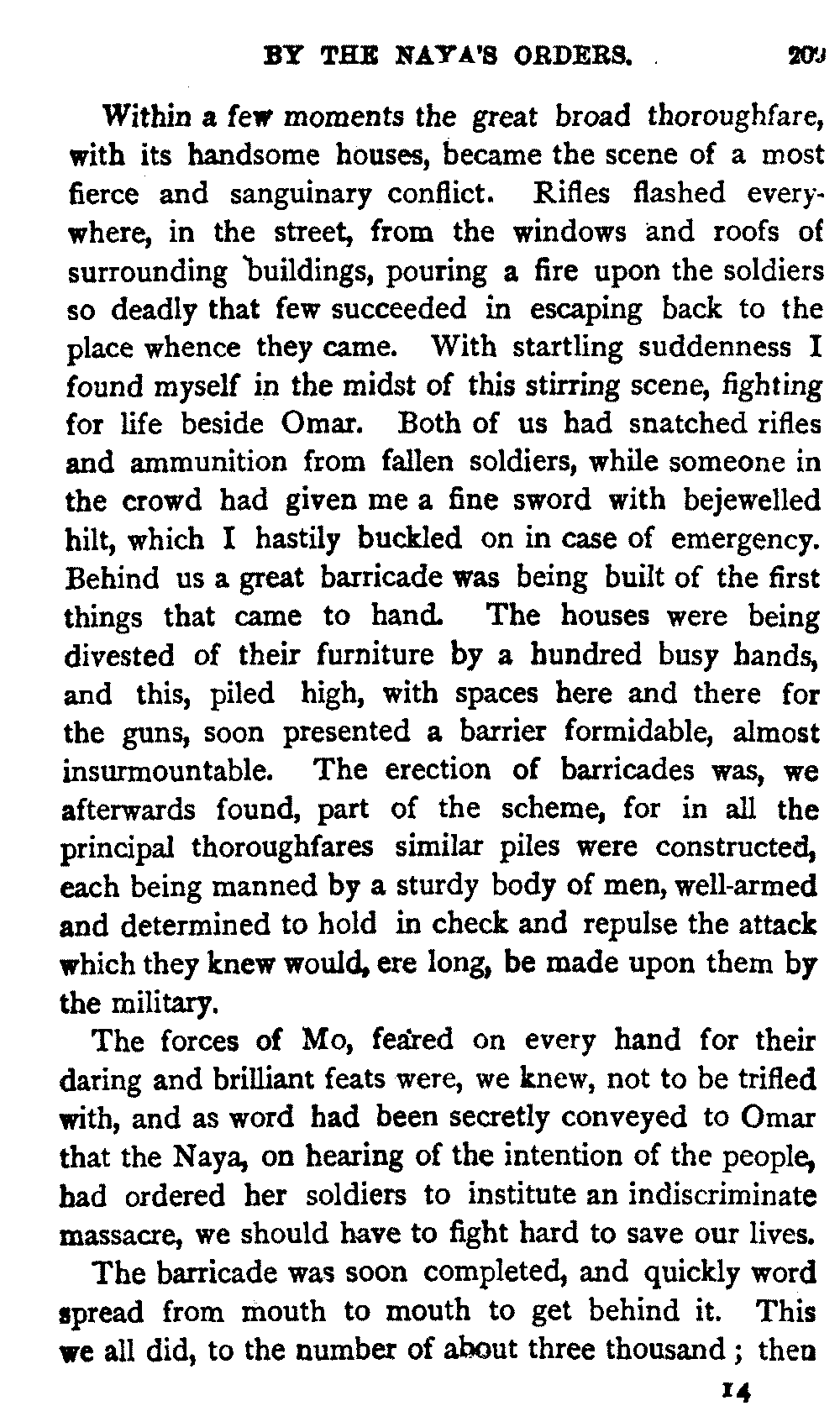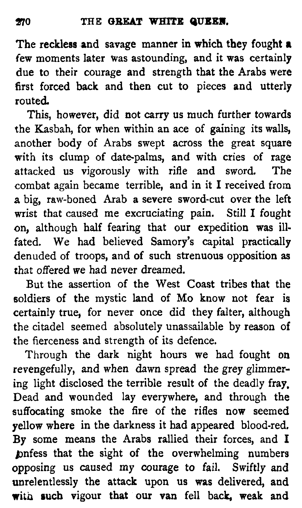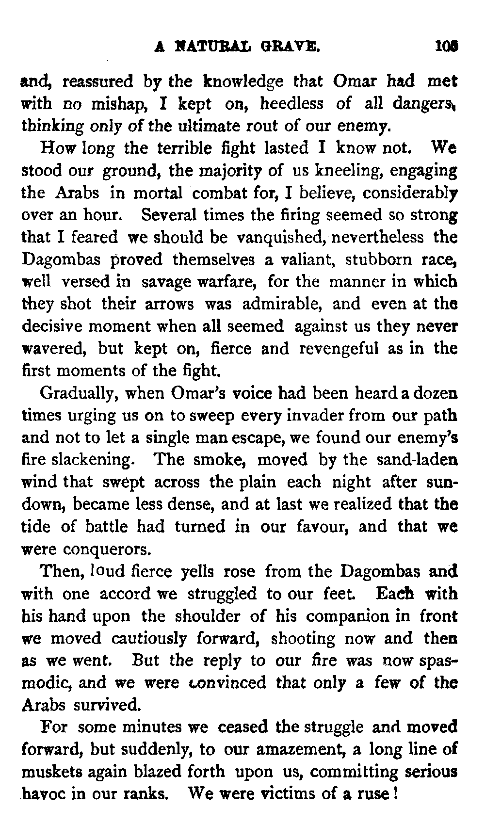 Everybody laughed, but to their astonishment within five minutes our champion pugilist lay on the ground with swollen eye and sanguinary nose, imploring for mercy. That he could fight Omar quickly showed us, and as he released the bully after giving him a sound dressing as a cat would shake a rat, he turned to us and with a laugh observed—