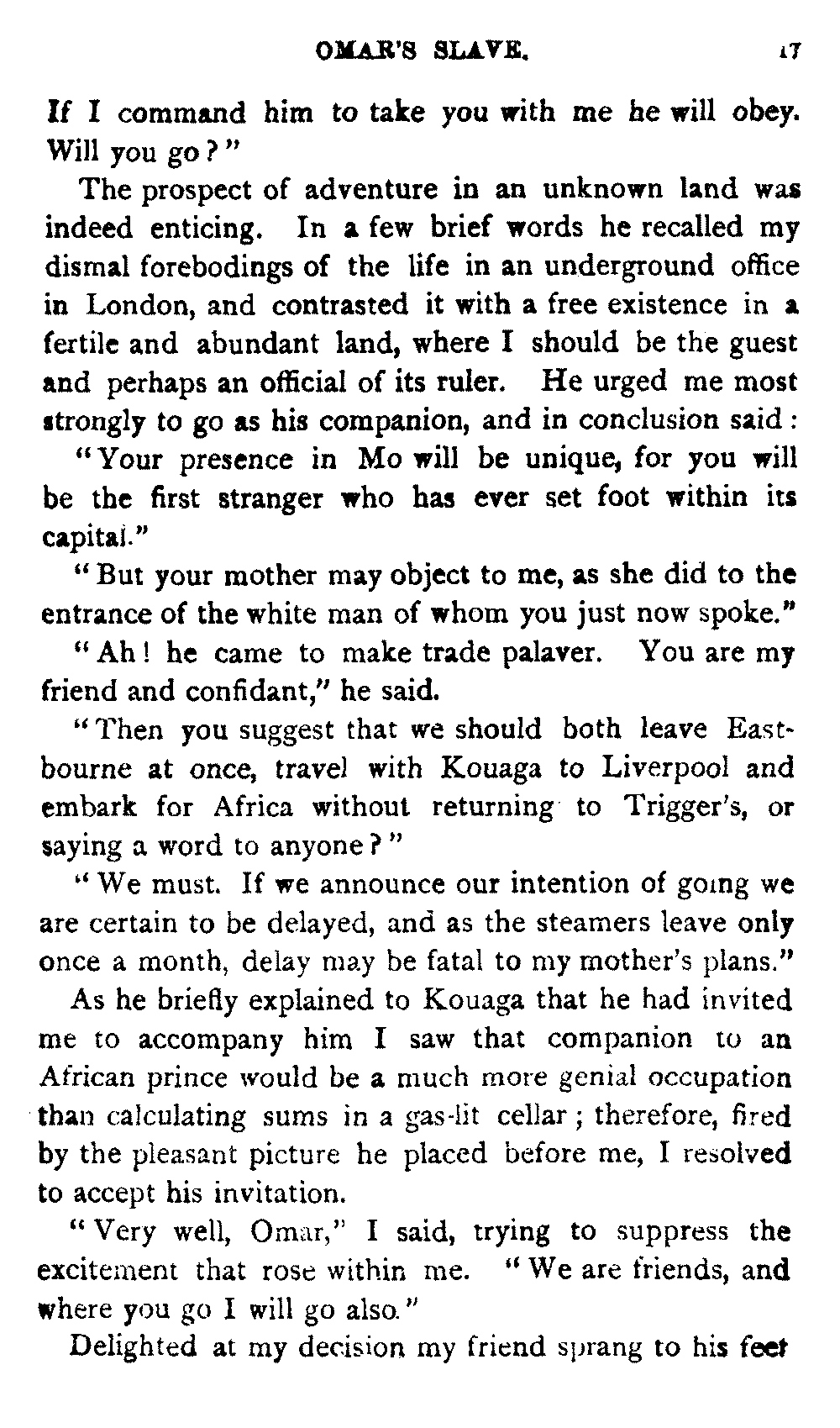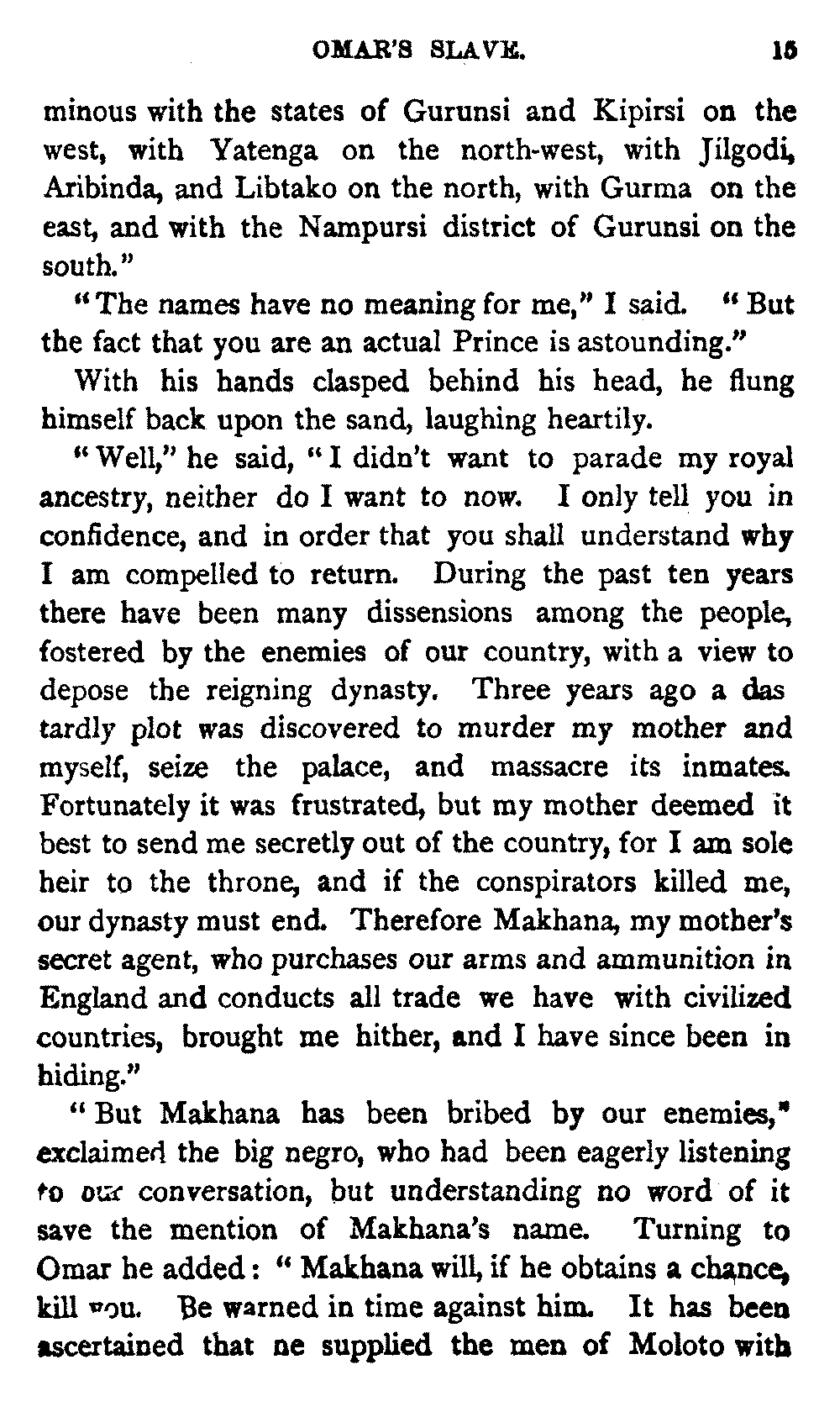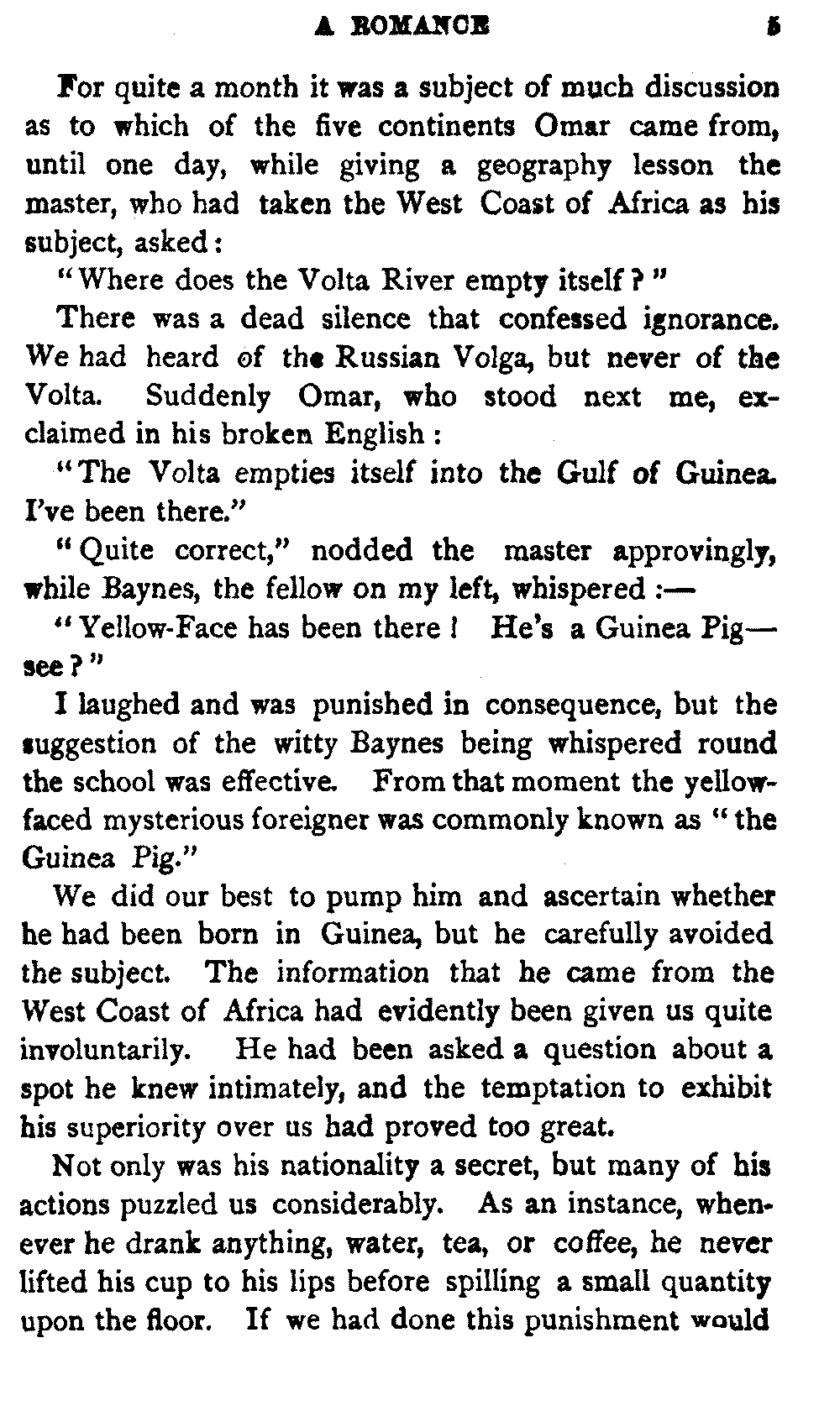 [5] For quite a month it was a subject of much discussion as to which of the five continents Omar came from, until one day, while giving a geography lesson the master, who had taken the West Coast of Africa as his subject, asked: