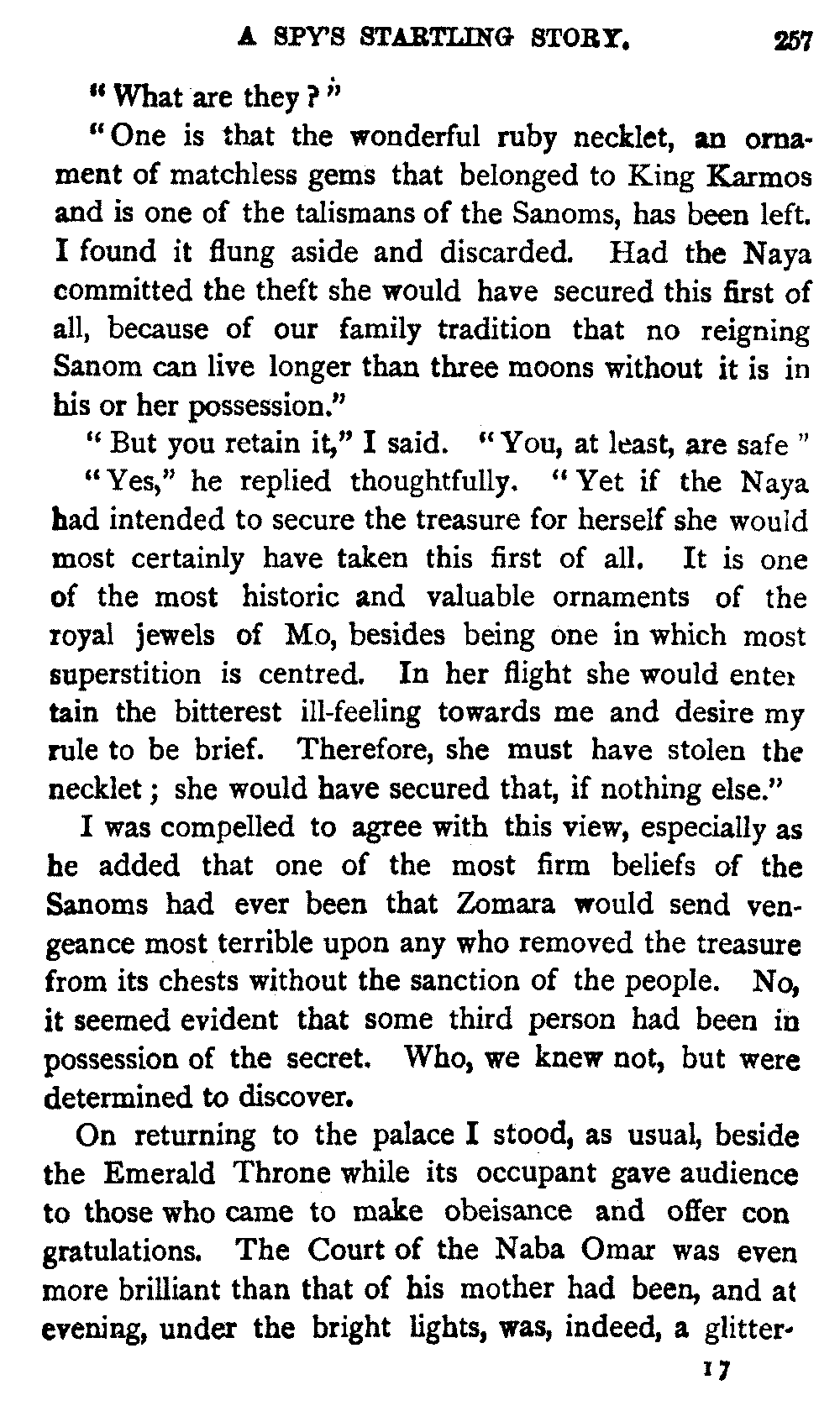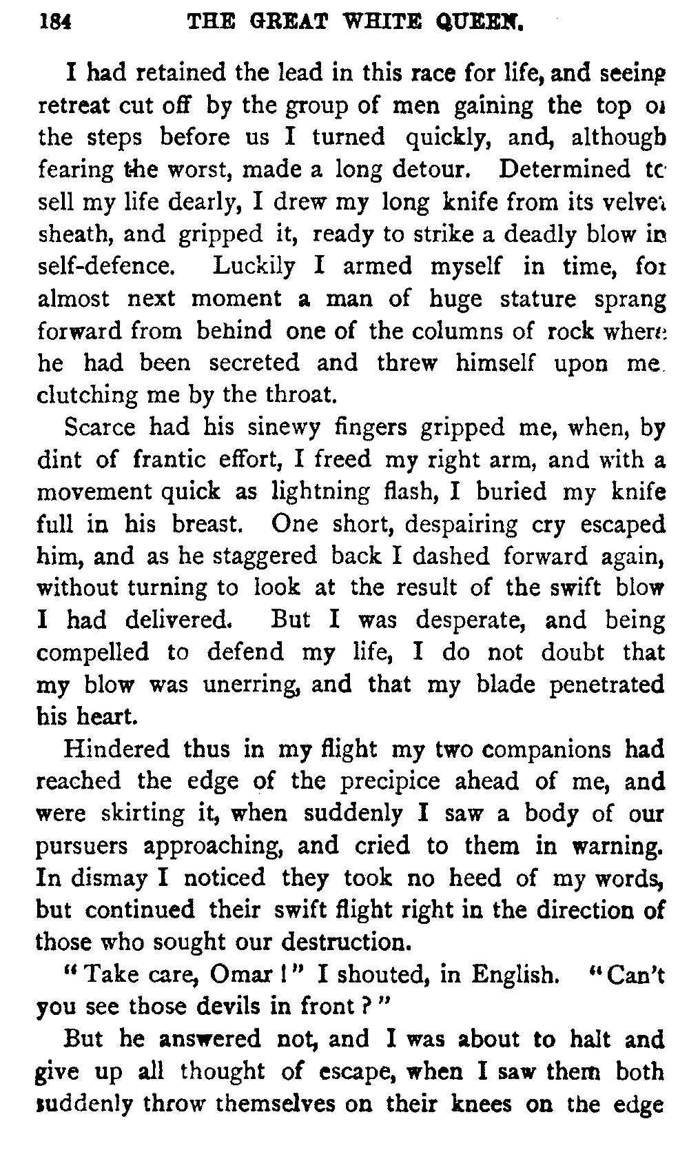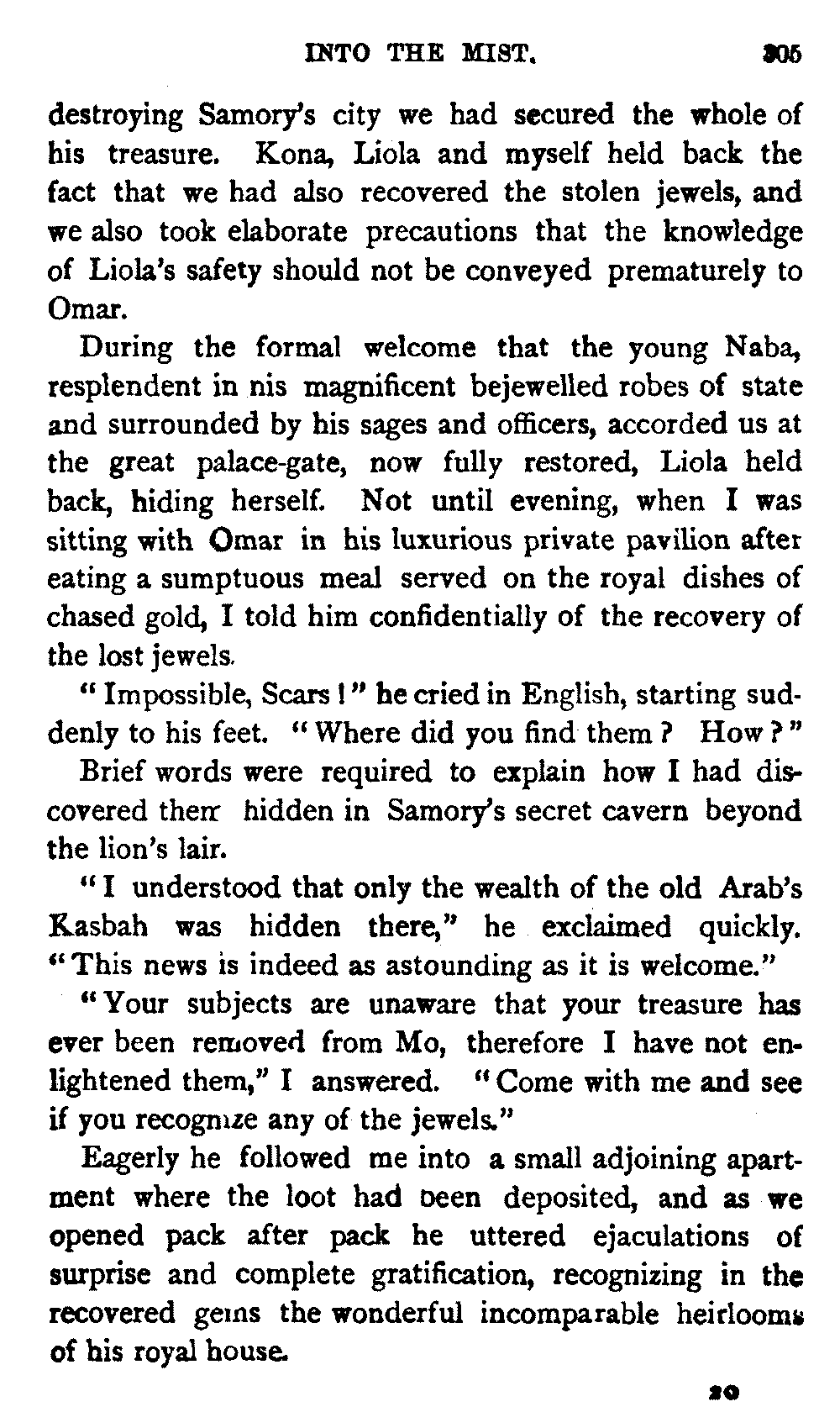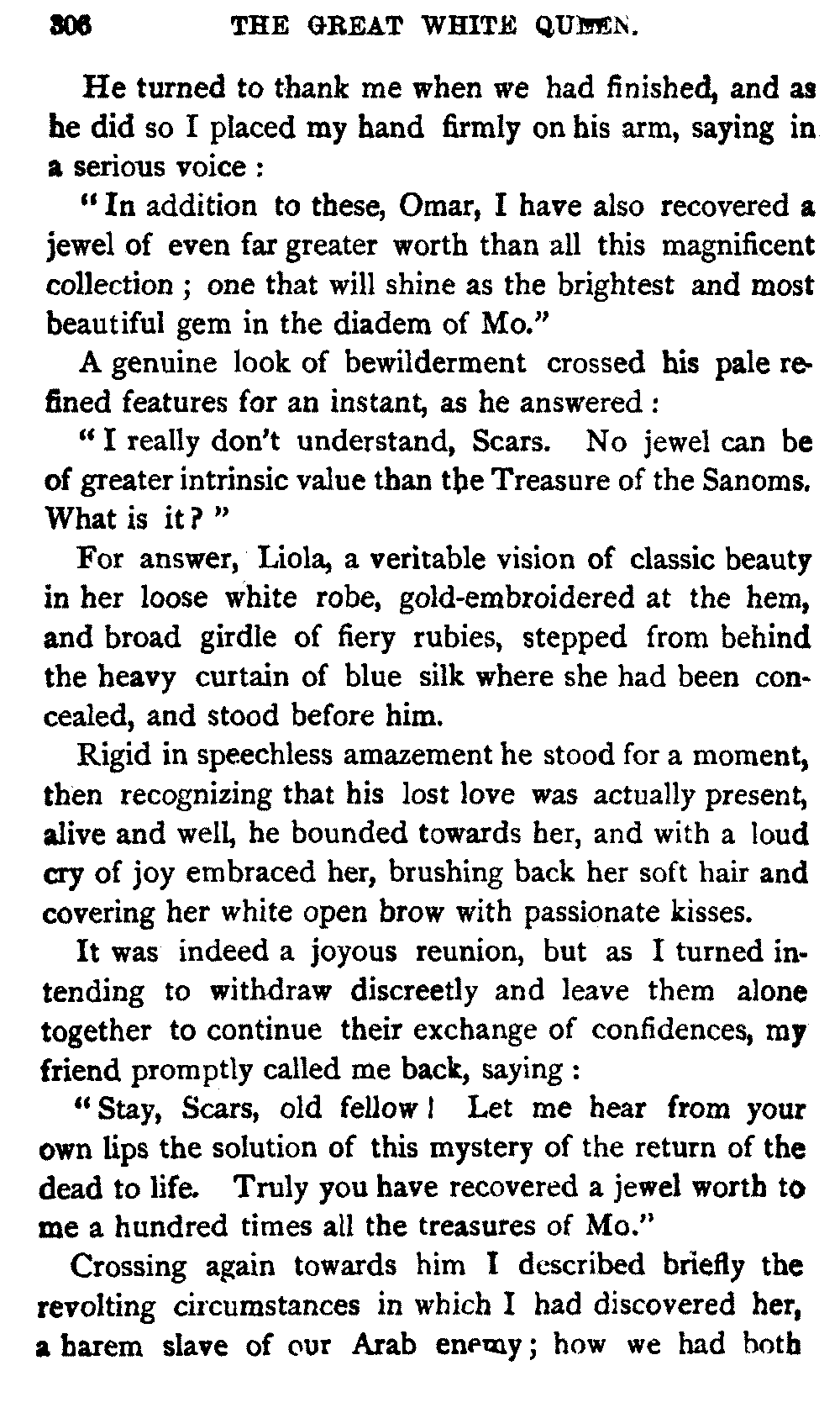 It was strange, however, that I never could get Omar to talk of himself. Confidential friends that we were, in possession of each other's secrets, he spoke freely of[8] everything except his past. That some remarkable romance enveloped him I felt certain, yet by no endeavour could I fathom the mystery.