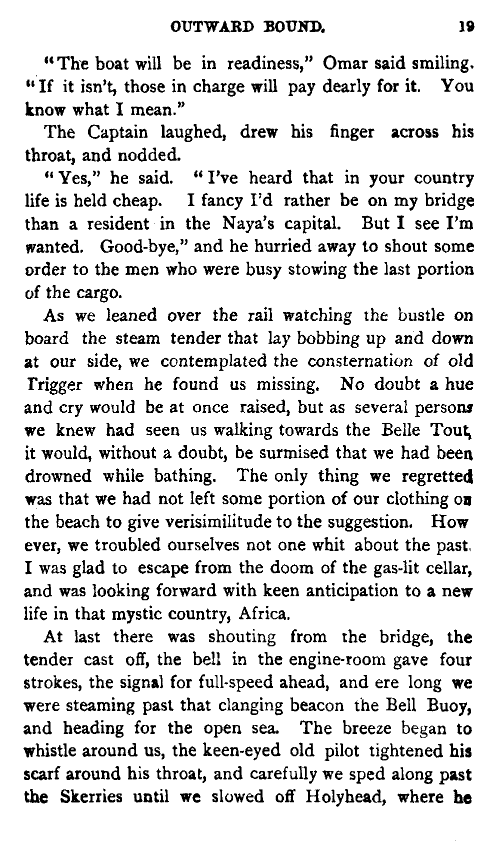 An hour passed and listeners at the keyhole of the Doctor's door could only hear mumbling, as if the negotiations were being carried on in the strictest secrecy. Presently, however, the black man wished Trigger good-day, and much to everyone's disgust and annoyance the yellow-faced stranger was brought in and introduced to us as Omar Sanom, the new boy.