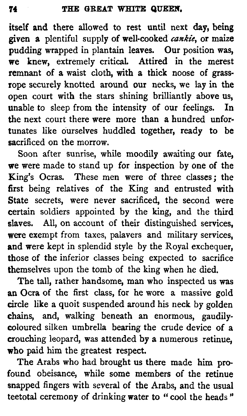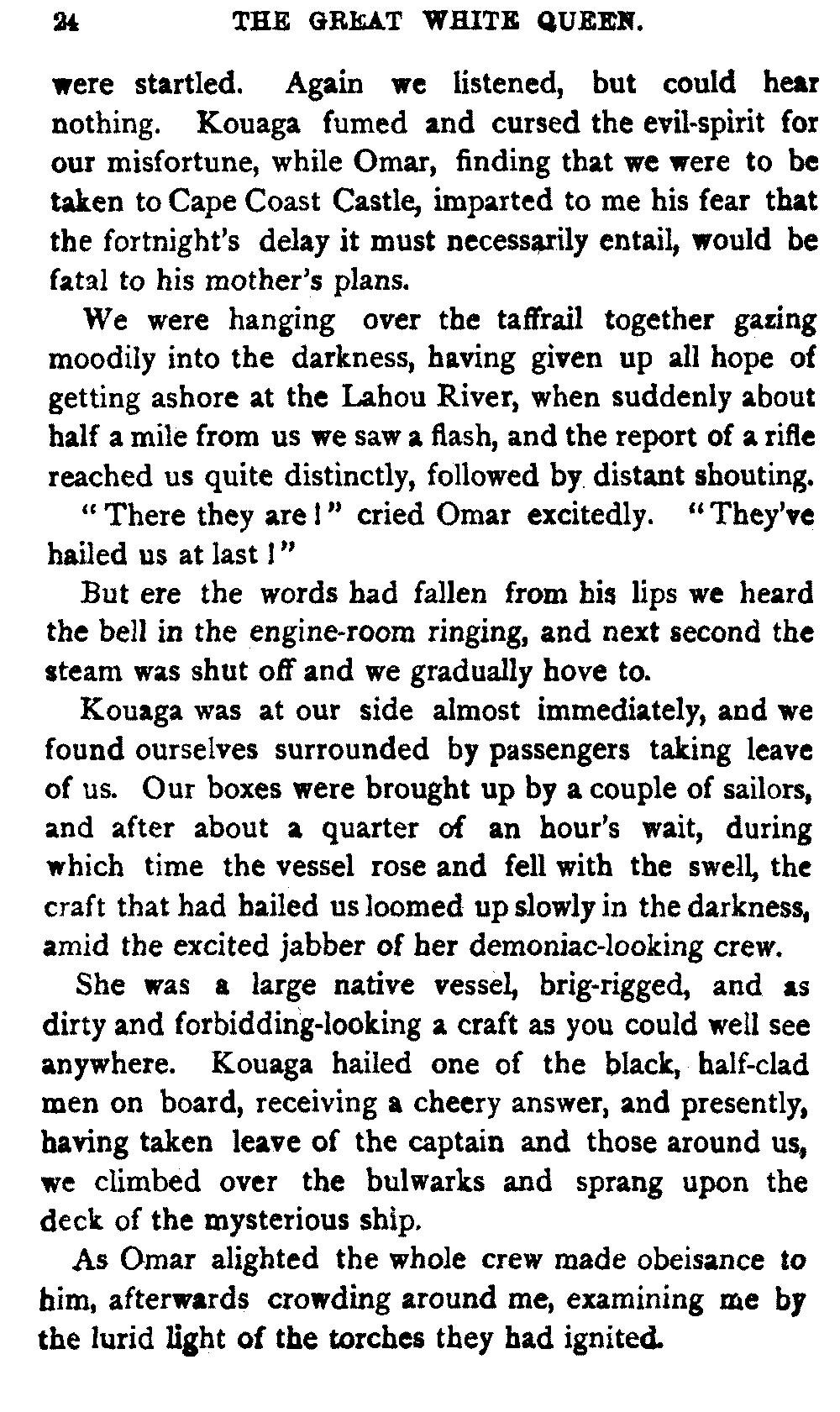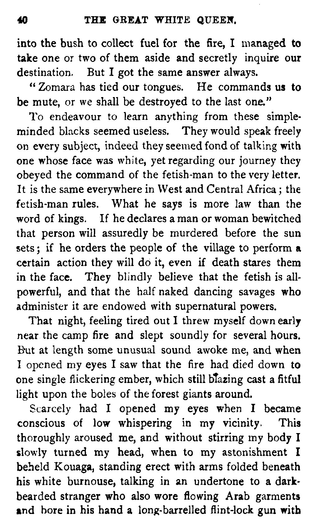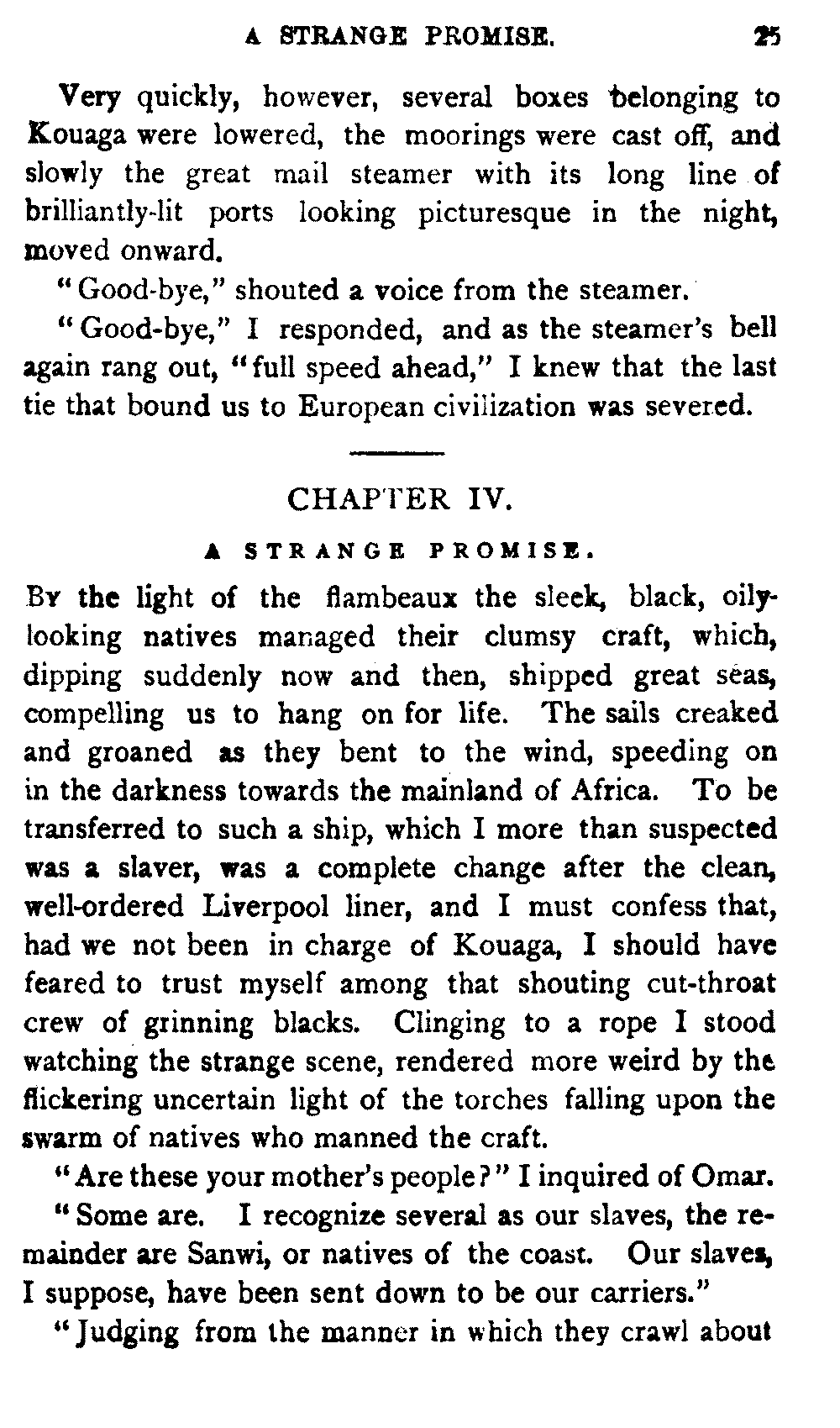 We did our best to pump him and ascertain whether he had been born in Guinea, but he carefully avoided the subject. The information that he came from the West Coast of Africa had evidently been given us quite involuntarily. He had been asked a question about a spot he knew intimately, and the temptation to exhibit his superiority over us had proved too great.