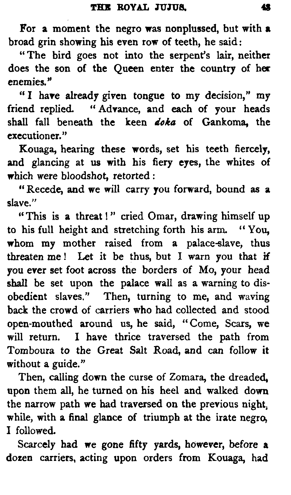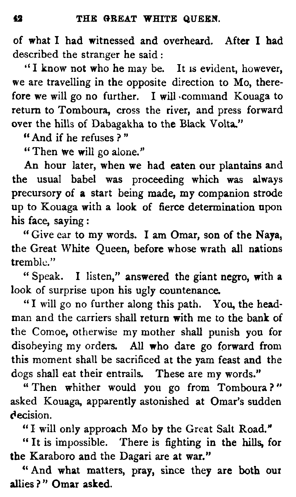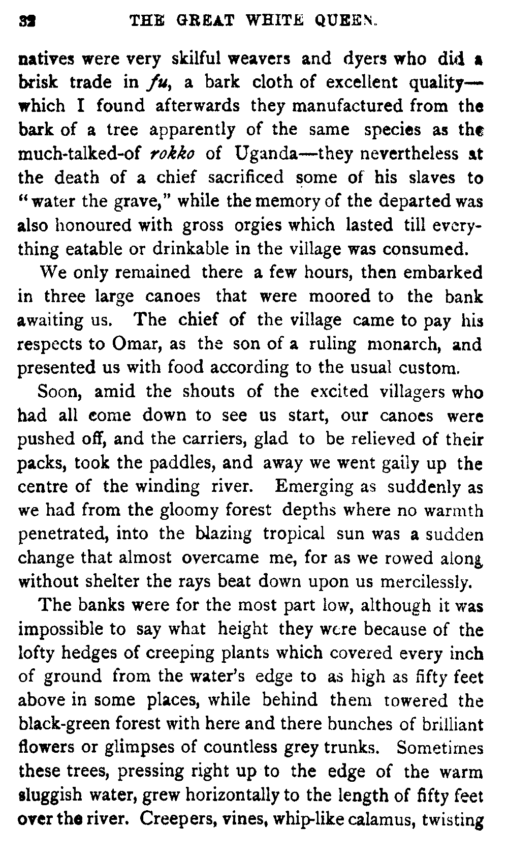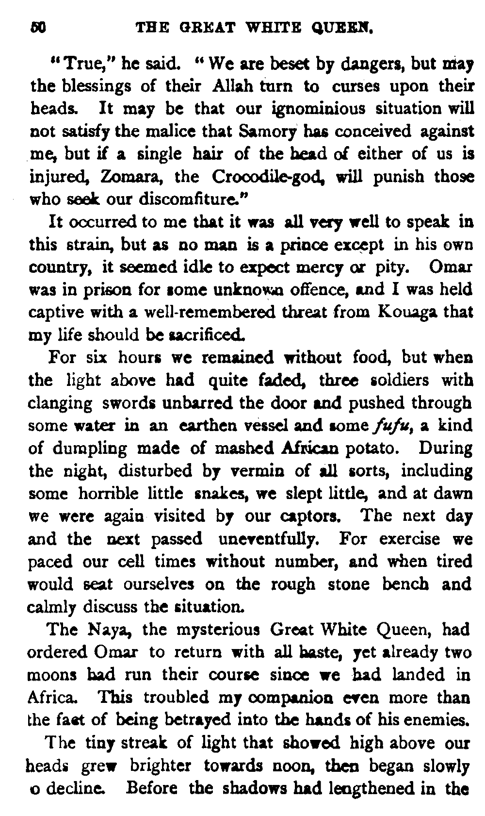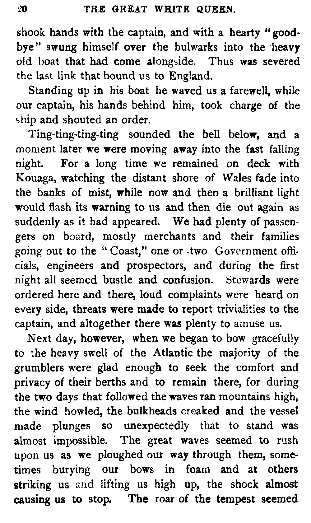 We did our best to pump him and ascertain whether he had been born in Guinea, but he carefully avoided the subject. The information that he came from the West Coast of Africa had evidently been given us quite involuntarily. He had been asked a question about a spot he knew intimately, and the temptation to exhibit his superiority over us had proved too great.