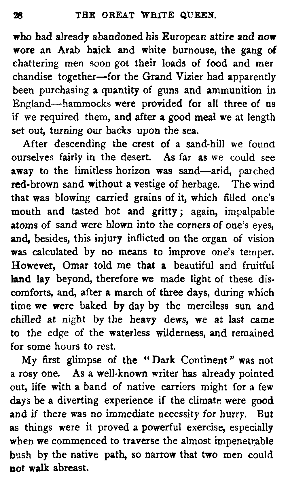 Three years ago I had as little expectation of emulating the intrepidity of Stanley as I had of usurping the throne of England. An orphan, both of whose parents had been drowned in a yachting accident in the Solent and whose elder brother succeeded to the estate, I was left in the care of a maternal uncle, a regular martinet, who sent me for several long and dreary years to Dr. Tregear's well-known Grammar-school at Eastbourne,[2] and had given me to understand that I should eventually enter his office in London. Briefly, I was, when old enough, to follow the prosaic and ill-paid avocation of clerk. But for a combination of circumstances, I should have, by this time, budded into one of those silk-hatted, patent-booted, milk-and-bun lunchers who sit on their high perches and drive a pen from ten till four at a salary of sixteen shillings weekly. Such was the calling my relative thought good enough for me, although his own sons were being trained for professional careers. In his own estimation all his ideas were noble and his generosity unbounded; but not in mine.