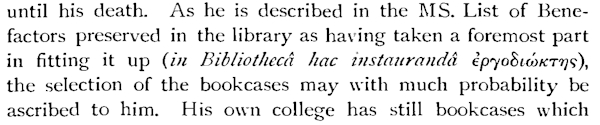 I have also to thank Señor Ricardo Velasquez for his beautiful elevation of the bookcases in the Escõrial Library; Father J. van den Gheyn, S.J., of the Royal Library, Brussels, for his trouble in shewing me, and allowing me to have photographed, several MSS. from the library under his charge; my friends Mr T. G. Jackson, R.A., Architect, for lending me his section of Bishop Cobham's library at Oxford; E. W. B. Nicholson, M.A., Librarian, and Falconer Madan, M.A., Sub-Librarian, in the Bodleian Library, for information respecting the building and its contents; Mr F. E. Bickley of the British Museum for much help in finding and examining MSS.; and Lionel Cust, M.A., Director of the National Portrait Gallery, for general direction and encouragement.