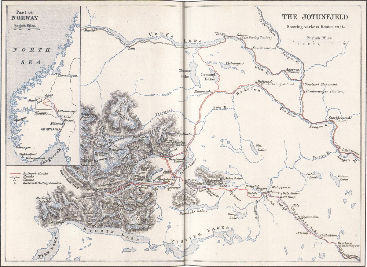 Then he turned his gaze in the opposite direction, and oh, joy! our luggage and boats were in sight, and arrived directly afterwards. The man in charge said he had travelled all night with them without sleeping, and to judge from his appearance we imagined that his statement was correct. He had been sitting on the Skipper’s bag for thirty-eight miles, and from the state of its interior we calculated his weight to be about twenty-two stone. He was very ill-tempered after his mere trifle of a journey and vigil, and asked for more money on hearing that he had three quarters 29 of a mile further to go. This was very sad, and we thought showed an unchristian spirit; but we sternly urged him forward, and all ended happily on our arrival at Espedals, when we paid him his money and a shilling extra.