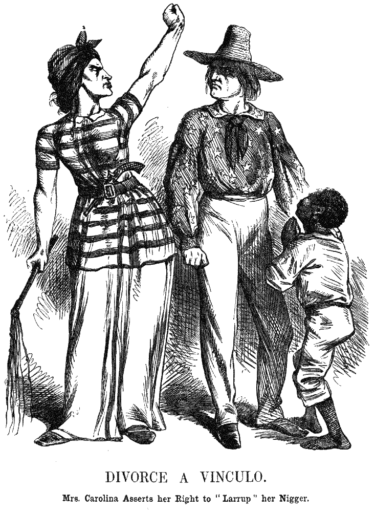When the news of the secession of South Carolina reached England, in January, 1861, John Tenniel contributed a cartoon to the jester's pages entitled: "Divorce a Vinculo" with the explanatory subtitle "Mrs. Carolina asserts her rights to 'larrup' her nigger." Mrs. Carolina was represented as a vulgar virago holding a cat-o-nine tails in her right hand, and shaking her clenched left fist in the face of a serenely defiant youth, clad in a star-spangled shirt, to whom a little brat of a nigger appealed with clasped hands.