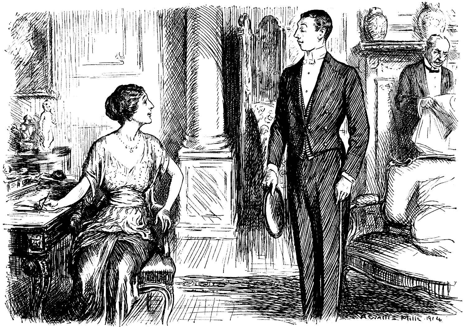 [pg 166]Sir George is not a nice man. He is a mercenary, narrow-minded person. I never really liked him, but then he never really liked me. However, he is Miranda's father, so I decided to interview him. The interview took place at his office. He waved me to a chair, and, as it seemed all that I was likely to get, I took it.