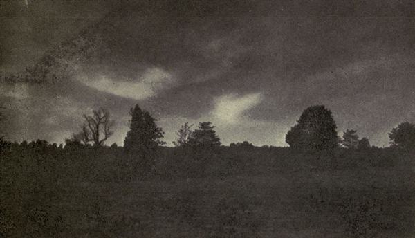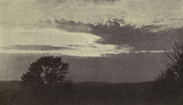Cirrus clouds first appear as feathery lines converging toward one or two points on the horizon, often merging into bands of darker clouds, arranged horizontally. A sky like this appears when there is little wind. If the wind shifts to an easterly direction by way of north there will likely be snow within 24 hours; if it works around by way of the southwest and south 36 hours will probably pass before rain. If the mares’ tails, as here, are absent and yet the stratified clouds are present there is little likelihood of a storm. Cirrus clouds precede every disturbance of magnitude. Sometimes they are hidden by a lower cloud layer.