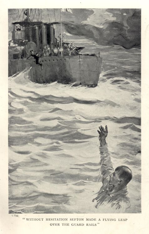 "Poising himself for an instant, Sefton leapt on the 'Calder's' deck"