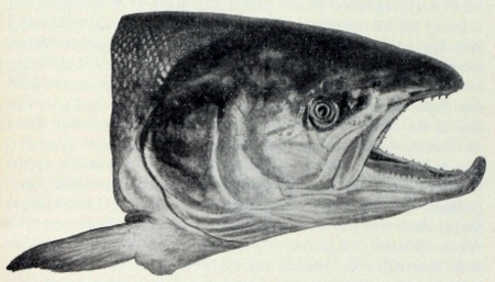Kopf eines Rheinlachses mit schwach ausgebildeten Haken. (Naturaufnahme von Dr. E. Bade.)