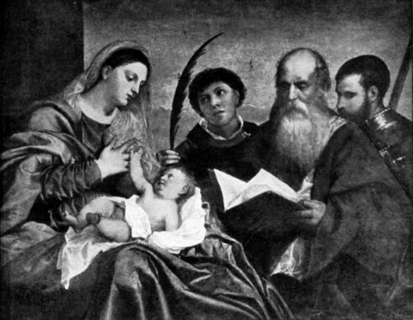 Yet in another mood Titian paints the life of the Holy Family as a pastoral idyl. A sunny landscape, a happy young mother, a laughing baby boy, bring the sacred subject very near to common human sympathies.