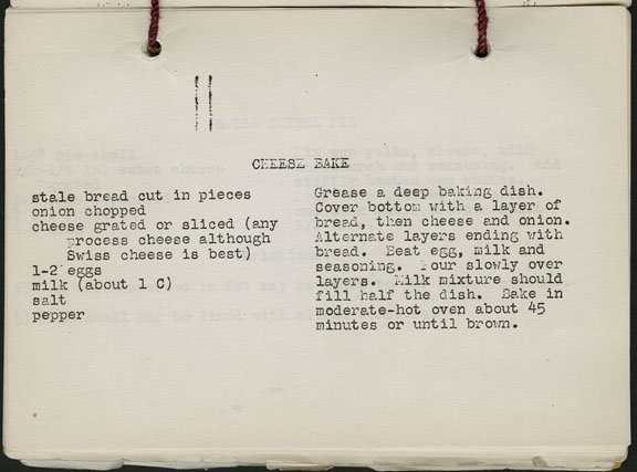 Grease a deep baking dish. Cover bottom with a layer of bread, then cheese and onion. Alternate layers ending with bread. Beat egg, milk and seasoning. Pour slowly over layers. Milk mixture should fill half the dish. Bake in moderate-hot oven about 45 minutes or until brown.